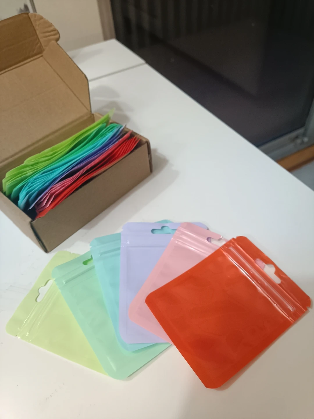 Pack of assorted colour resealable stand-up pouches with hanging holes. Great for organizing small items and crafts. Reusable and durable plastic material.