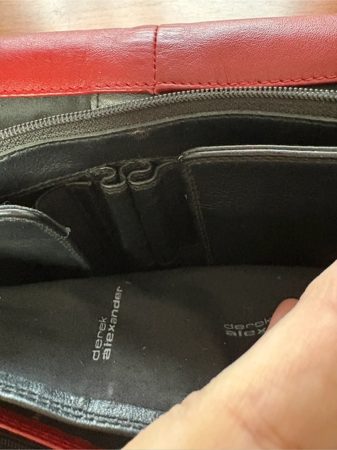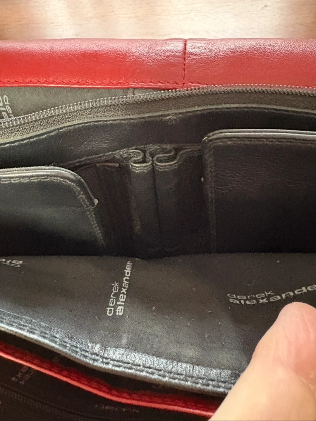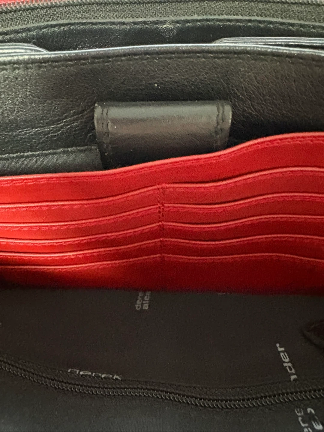 This Derek Alexander purse is made of genuine black and red leather. It features multiple card slots, this purse sells for 200.00