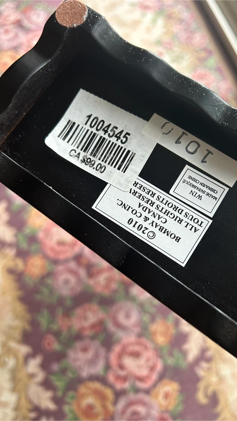 This black Westminster chime clock from Bombay features a yellow clock face with Roman numerals. It's made in China. This clock would look great on a mantelpiece or side table.