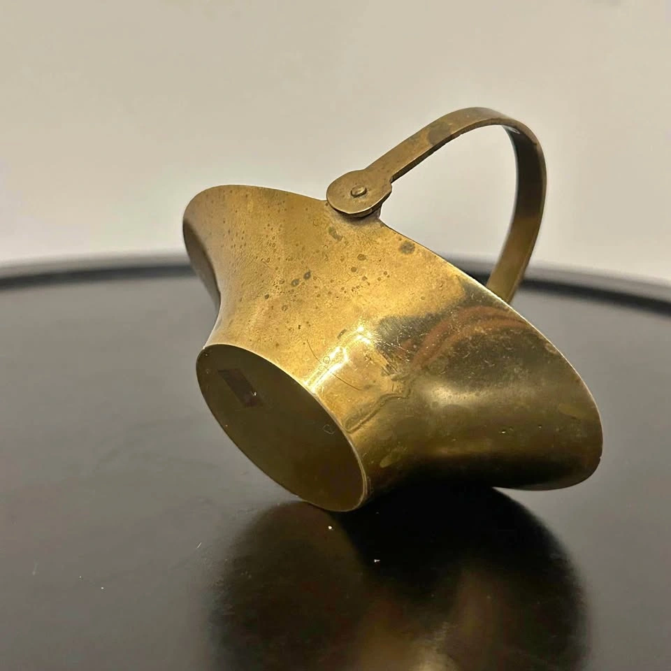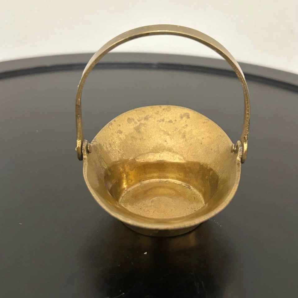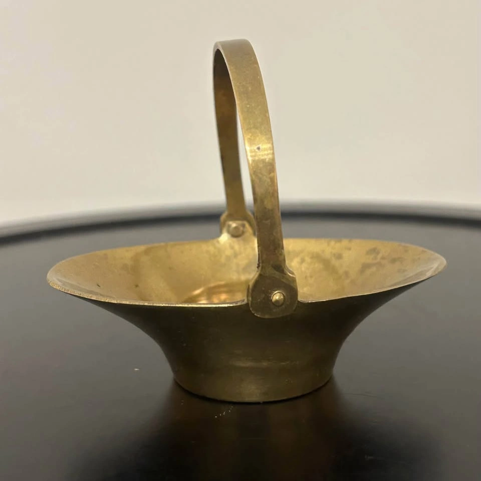 Charming vintage mini brass basket featuring a flared base and smooth curved handle. This timeless little piece makes a beautiful accent for a shelf, desk, or display case — perfect for holding rings, trinkets, or small flowers. The aged brass patina adds a lovely warm tone and vintage character.
