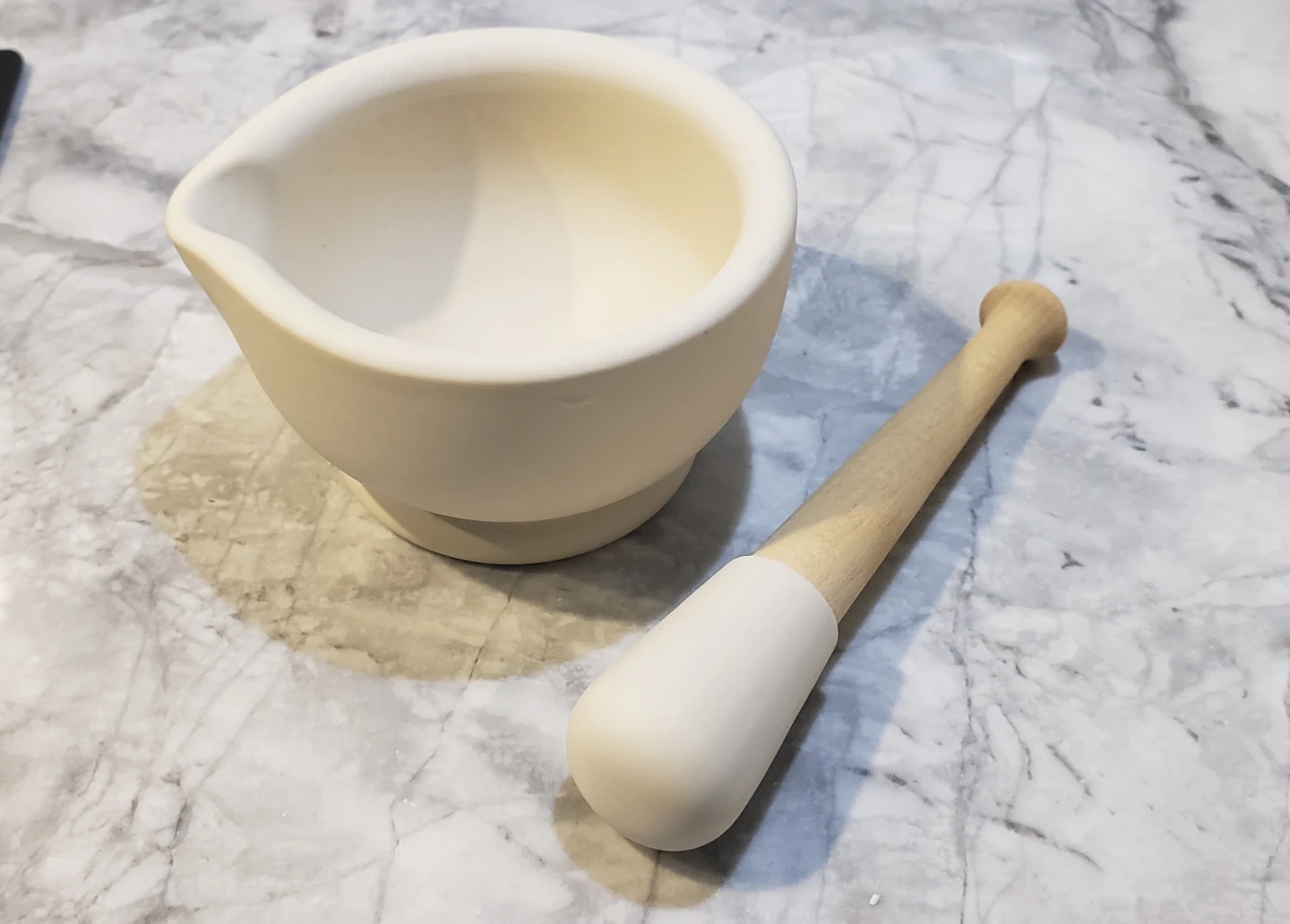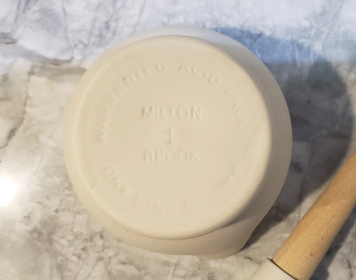 This is a Milton Roy ceramic mortar and pestle set. The mortar is 3.75 inches in diameter and 2.5 inches high. The pestle is 6 inches long and made of wood with a matching ceramic end. Colour is cream.