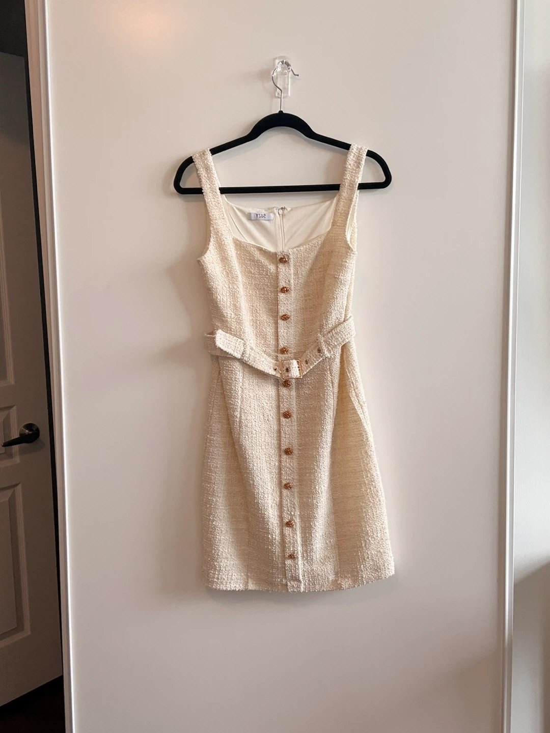 Cream tweed sleeveless dress with a button-front closure and a matching removable belt. It has a square neckline and a fully lined interior. This dress is perfect for a stylish day out!