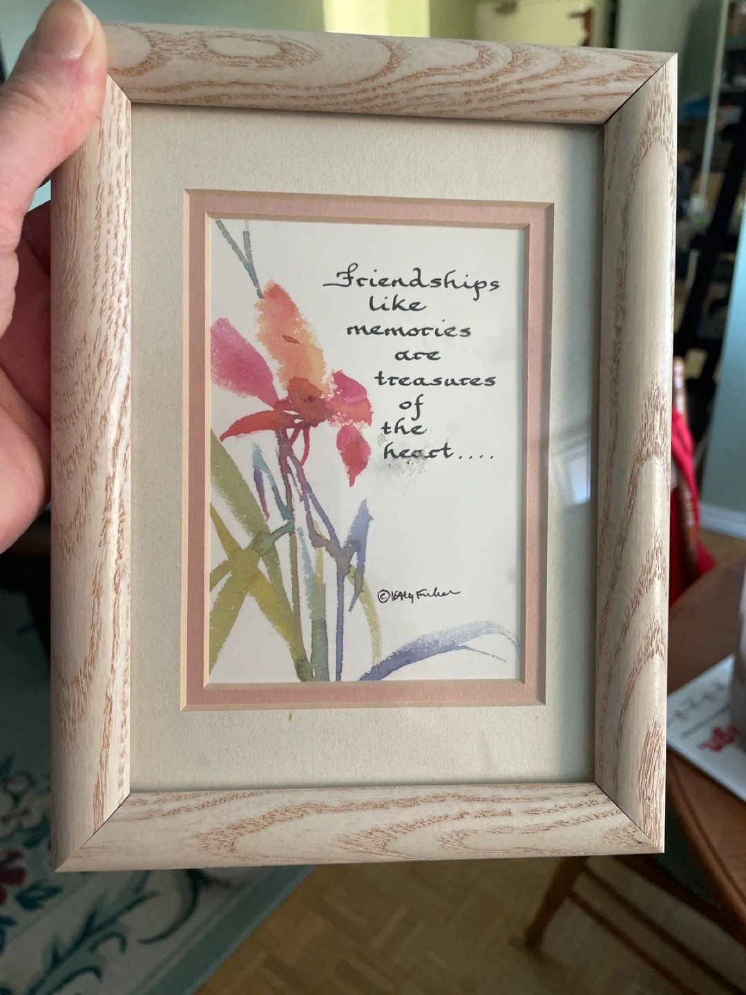 This framed picture features a watercolour floral design with the quote 'Friendships like memories are treasures of the heart....'. It has a light wood-tone frame and a pink matting. Ready to hang! Pick up only ๐