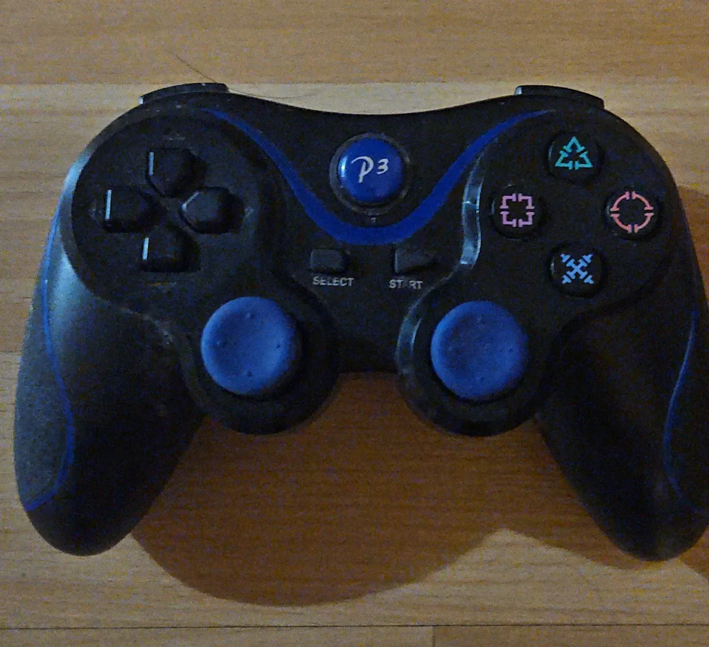 This is a black wireless game controller with blue accents. It features two analog sticks and standard PlayStation button layout, including select and start buttons. It's compatible with P3 systems n pc