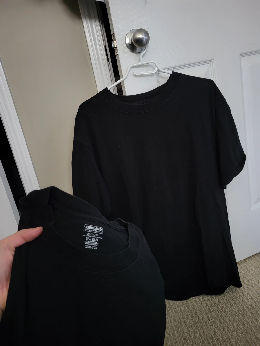 Kirkland Signature black t-shirts, size XL. Made from 100% cotton in Honduras. These are basic crew neck tees.