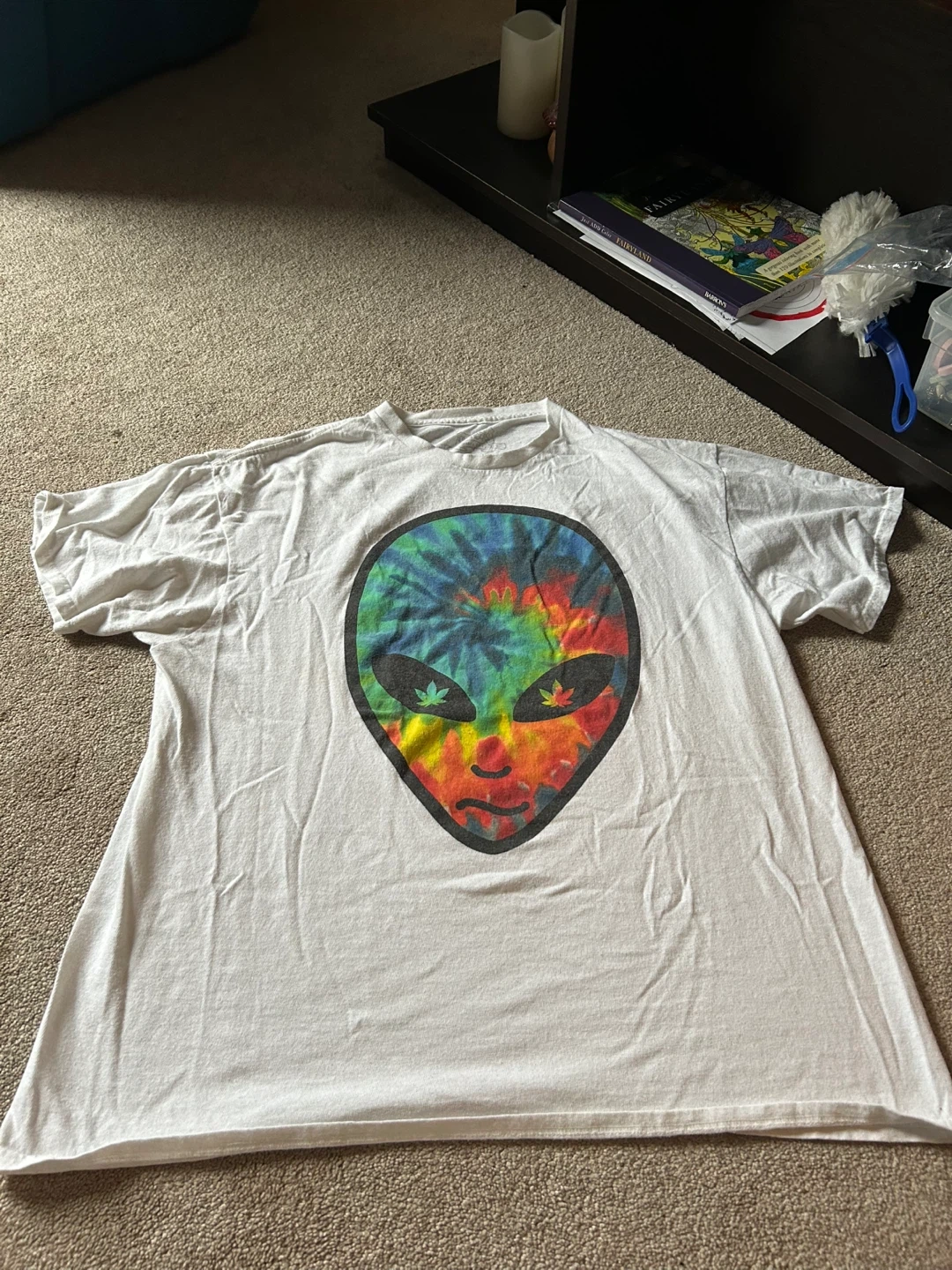 Great for alien lovers, stoner aesthetic, psychedelic fashion, festival wear, or streetwear outfits. Cool statement shirt and a fun piece for anyone into space, trippy art, or unique graphic tees.