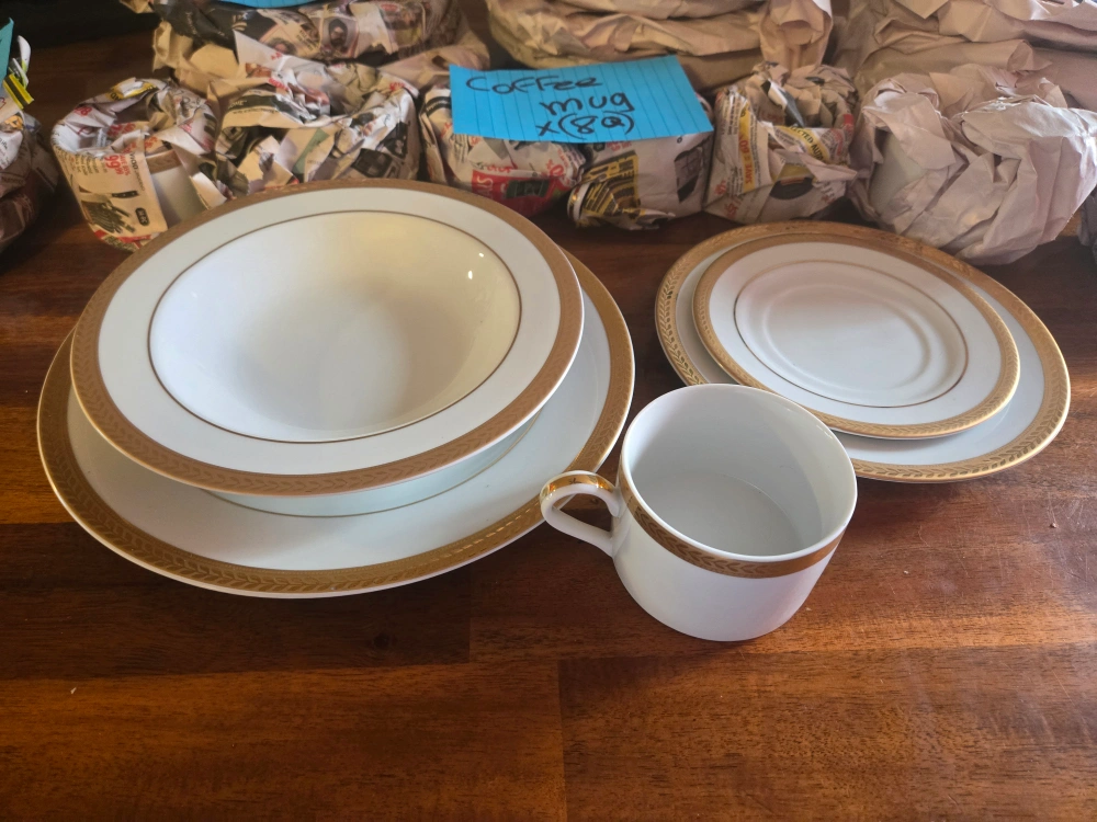 Elevate your dining experience with this elegant dinnerware set! This comprehensive collection features service for eight, including dinner plates (10.5"), salad plates (8.5"), rim soup bowls (9"), coffee mugs (6 oz), and matching saucers. Additionally, there are 80 plastic charger plates (13"). It's perfect for special occasions or adding a touch of luxury to everyday meals. This set has never been used and still has price tags on them.