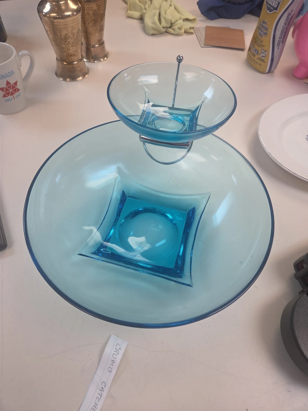 Two-tiered, great Vintage serving bowl with a blue glass finish. The tiered design is great for serving snacks or appetizers. Glass material.
