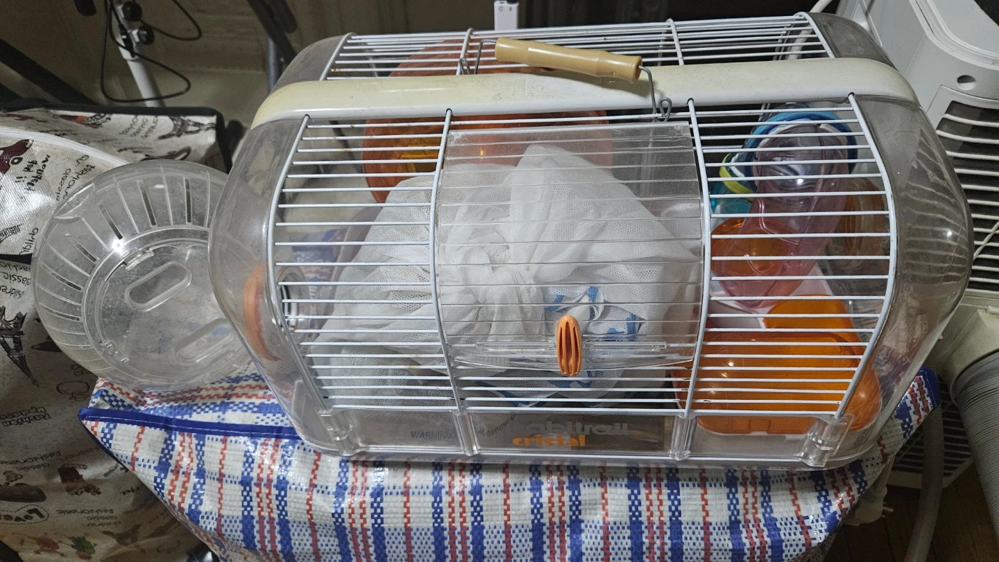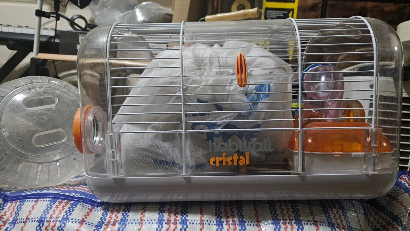 This is a Habitrail Cristal hamster cage. It's made of clear plastic with a wire top. Includes a water bottle, 1 tube tunnel and food dish. A hamster exercise wheel and ball is also included!