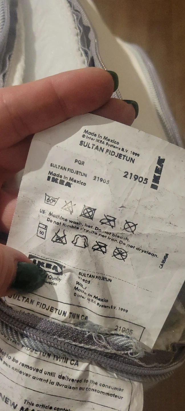 This is an IKEA SULTAN FIDJETUN twin mattress. It's made in Mexico. The mattress is yellow foam with a white cover. It measures 39 inches wide by 75 inches long.