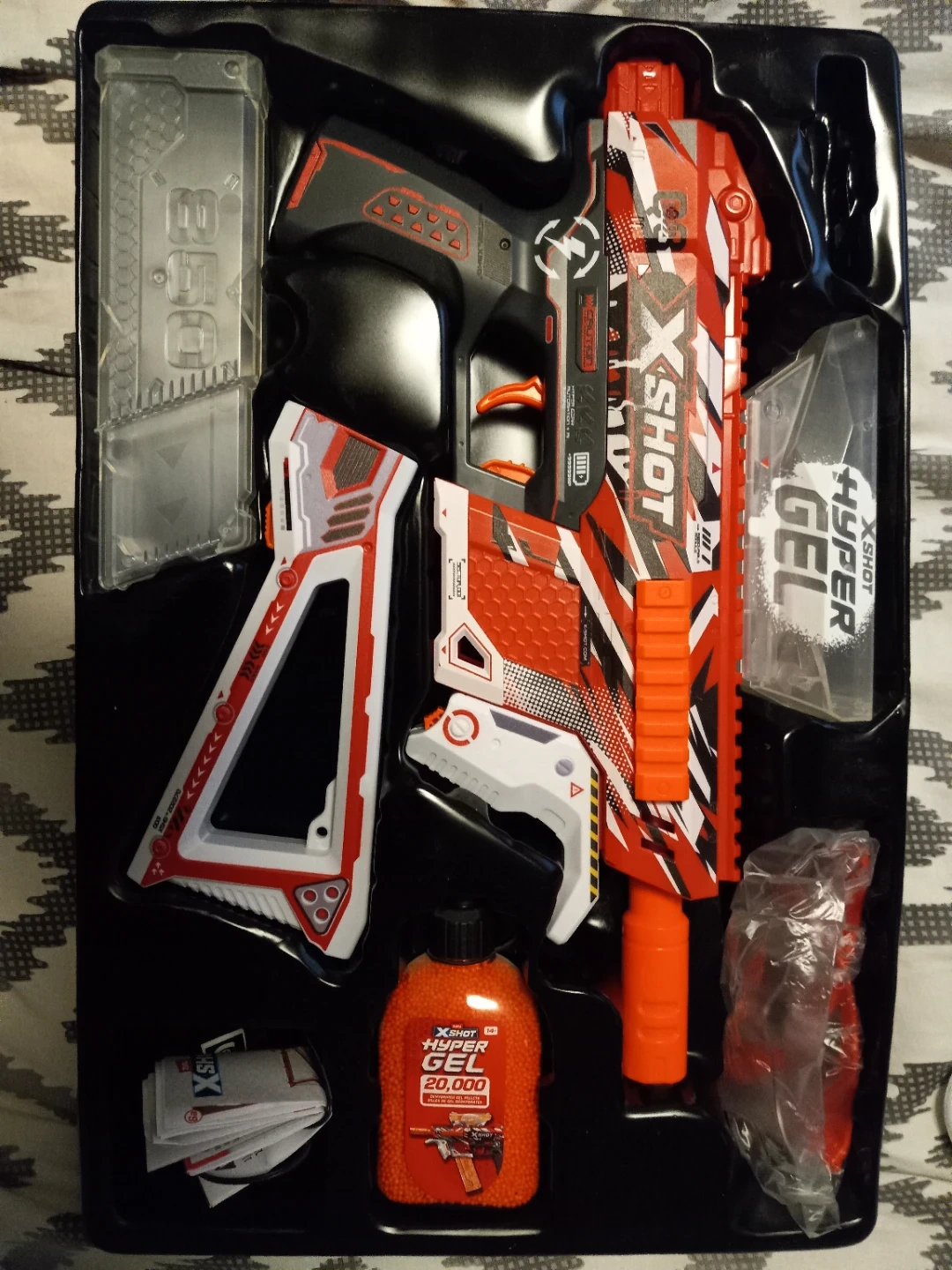 Selling a Zuru XShot Hyper Gel Trace Fire Blaster. It is a motorized gel blaster pistol. The capacity is 600 + 850. It shoots at 170 FPS. It is fully/semi automatic. It comes with 1bottles of 20,000 hyper gel. Extra 60,000 gel pellets. Extra (2 bottles of 20,000 gel pellets and several unopened packs of gel pellets as well).