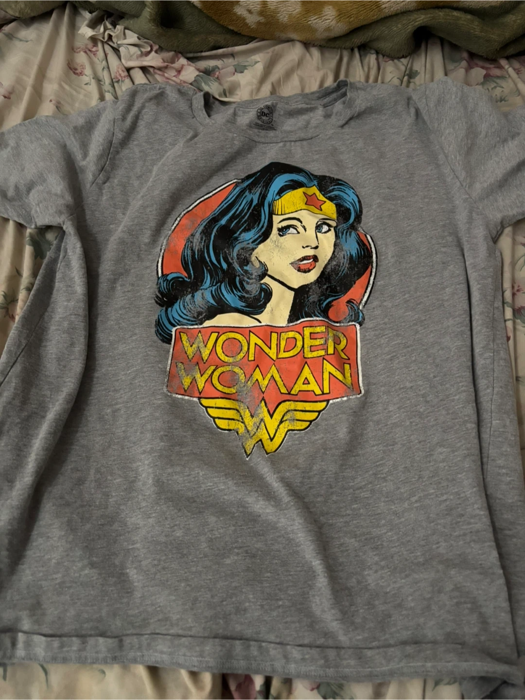 Grey t-shirt featuring a vintage-style Wonder Woman graphic. Made from a soft cotton blend. A classic superhero design for any fan! Adult size X-Large