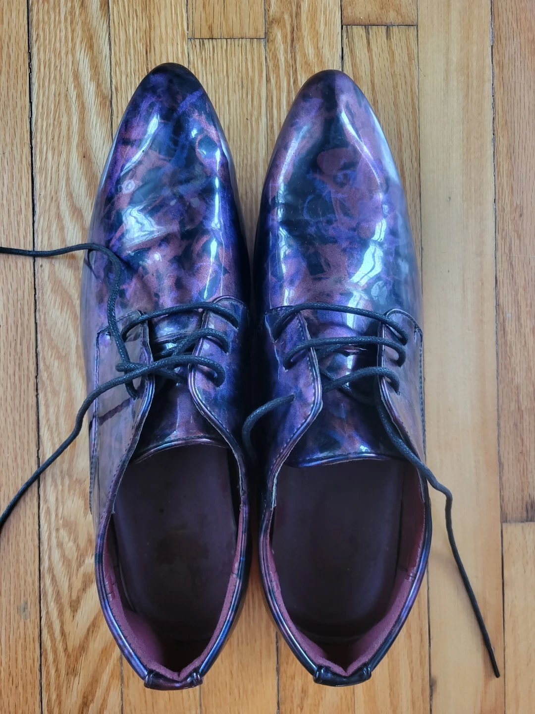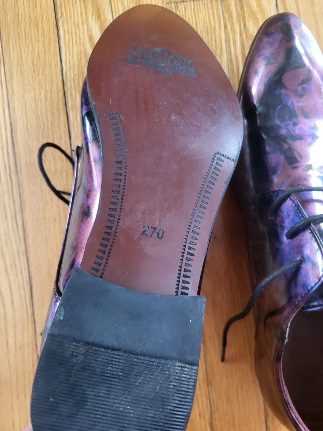 JUNHONG PRESTIGE men's dress shoes in a striking purple floral patent finish. These stylish shoes are a size 270. Size 10 Canadian. The interior lining is a rich burgundy colour.