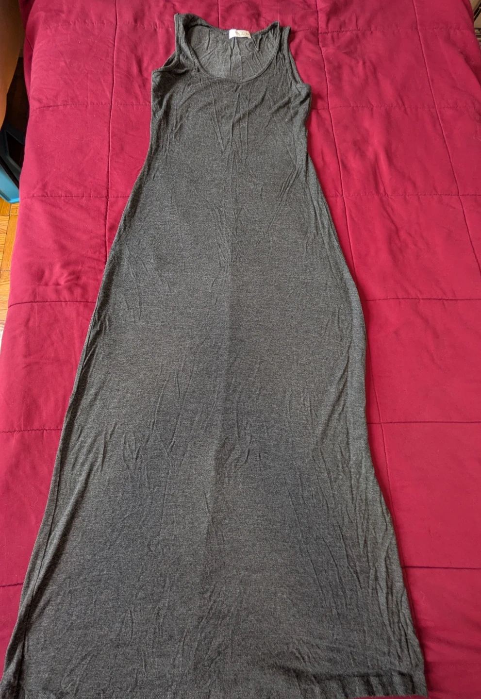Comfy grey sleeveless maxi dress with a stylish open back cutout. It's made from a soft, stretchy material. This dress is perfect for warmer days!