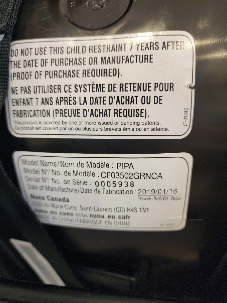 2019 manufacturing date, still good until 2026. Missing infant insert.