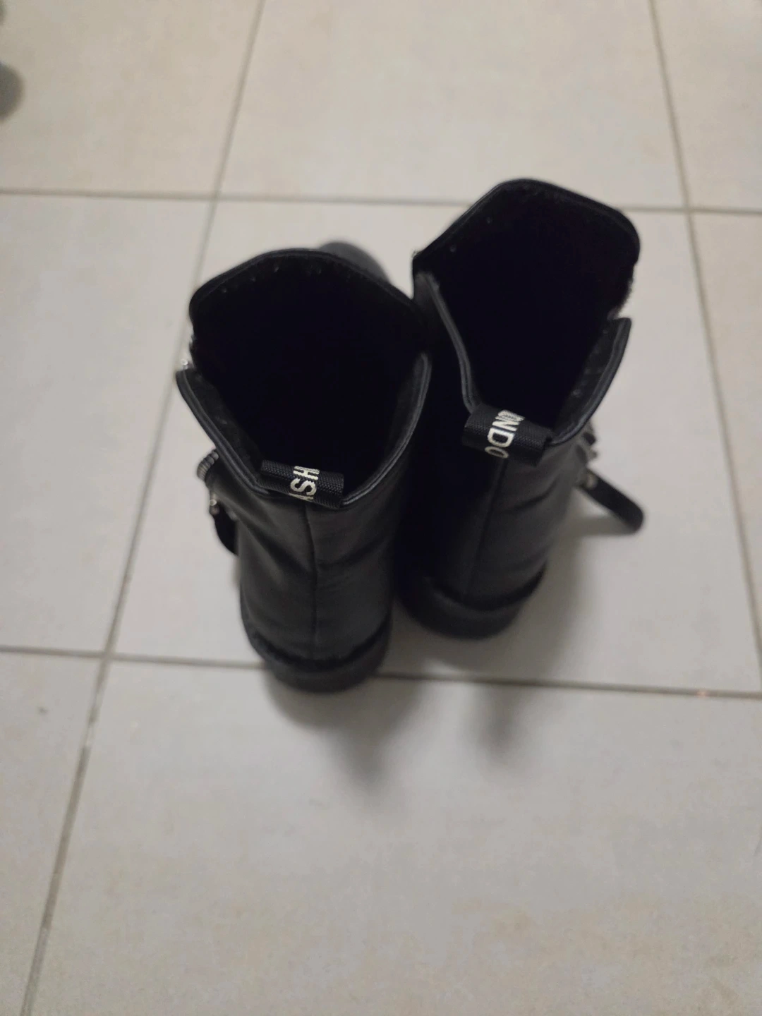 These black ankle boots are made from faux leather and feature side zippers for easy on and off. The sole has a textured grip. A decorative buckle strap is also present.