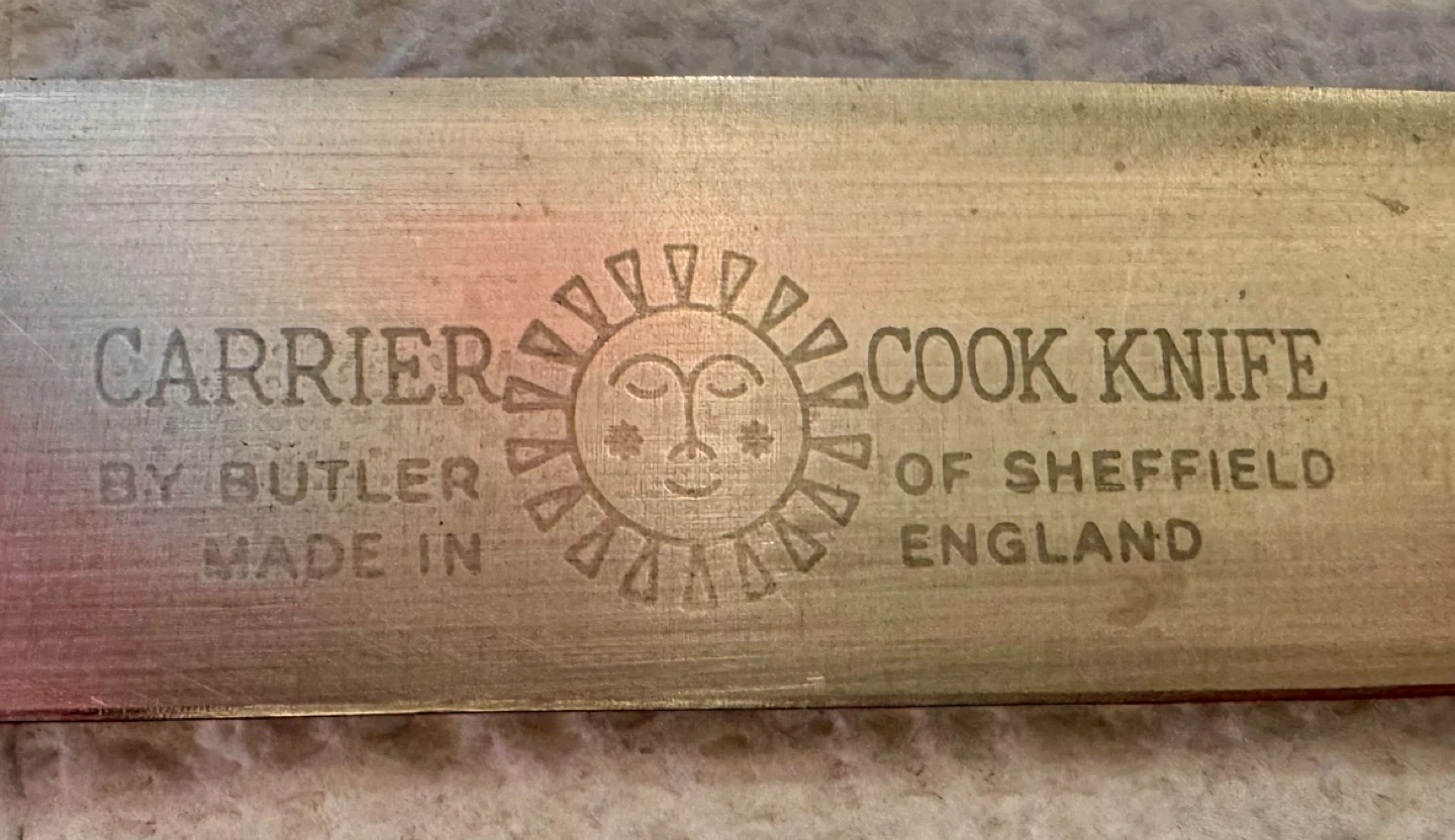 Selling a vintage set of Carrier Cook knives by Butler of Sheffield, made in England. The set includes various knives and a fork, all with wooden handles. Blades are superior Sheffield steel. Wooden handles. Purchased new in London in the 1970s.