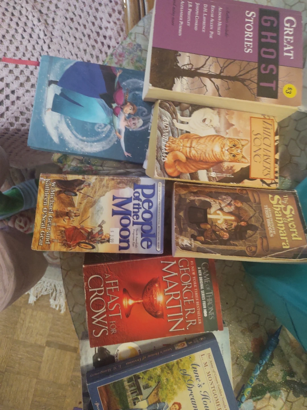A bundle of six paperback books featuring a variety of genres. Includes 'Frozen' themed book, 'People of the Moon', 'A Feast for Crows', 'The Sword Shannara', 'Great Ghost Stories', and 'Tailchasers Song'. Perfect for avid readers! Books are in good condition.