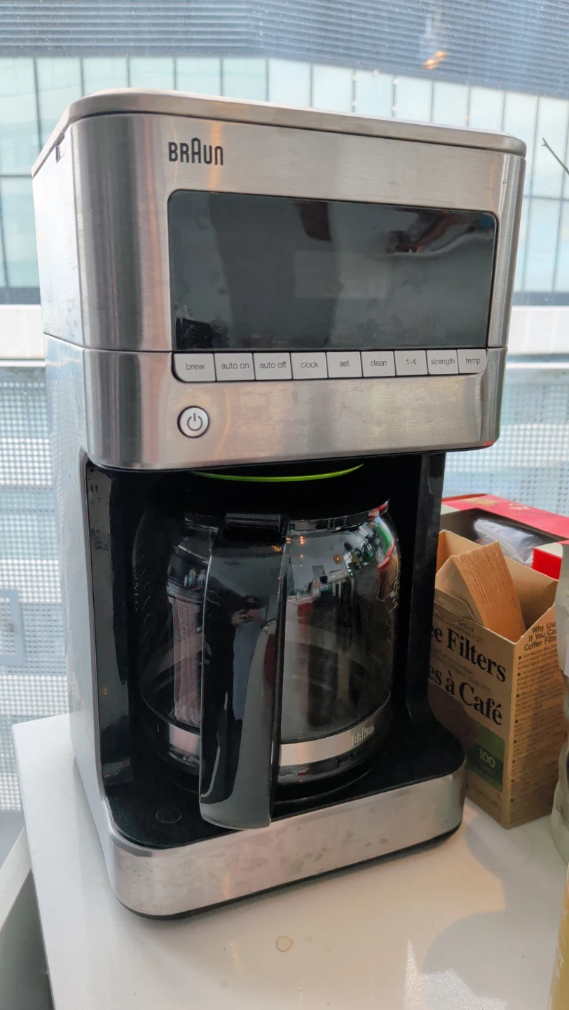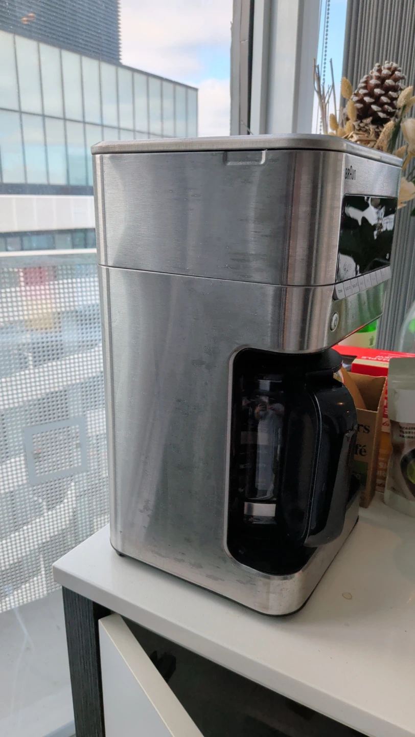 This is a Braun coffee maker with a brushed metal finish. It has programmable settings for brew strength and a clock function. The carafe is glass and holds multiple cups.