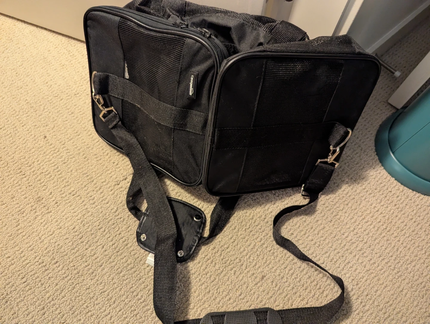 This is a black Amazon Basics pet carrier bag. It's made of durable fabric with mesh panels for ventilation. Includes a soft, removable liner inside. Zippers allow for easy access from the top and front.