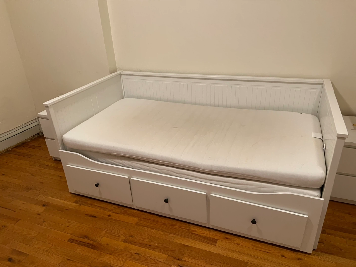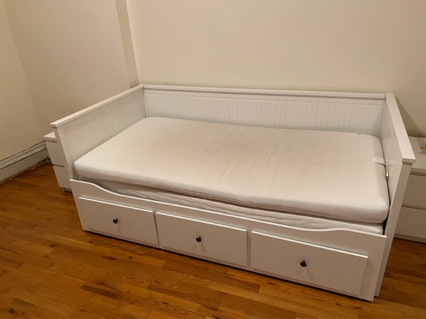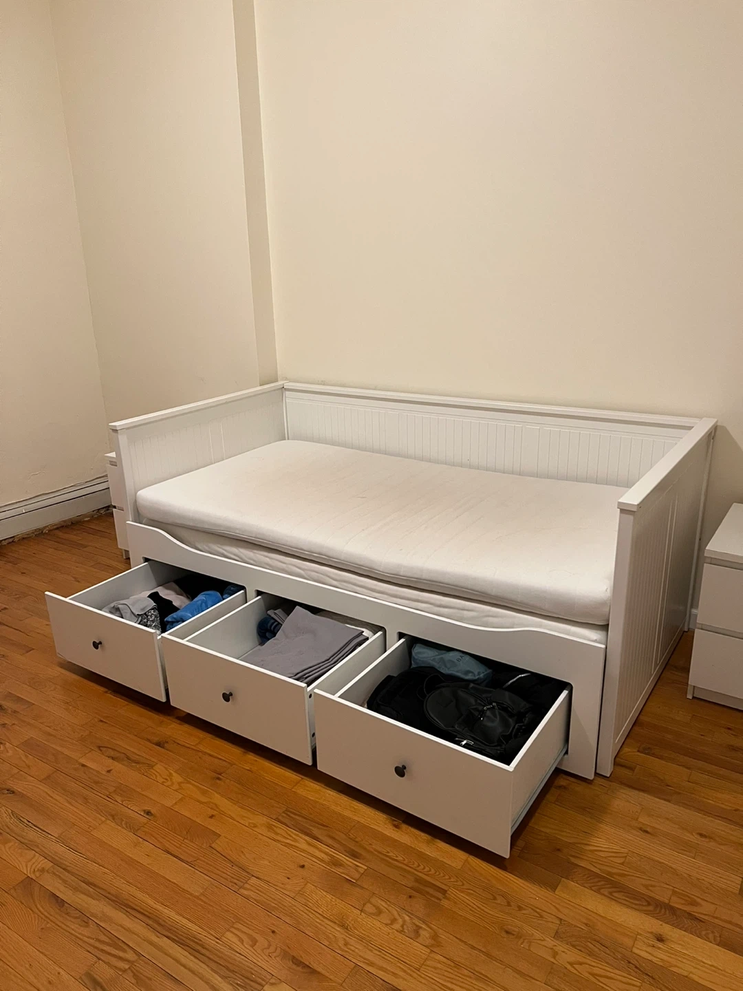 This white daybed offers a comfortable seating and sleeping solution. It features three spacious drawers built into its base for convenient storage. The bed frame is white with a slatted support system.