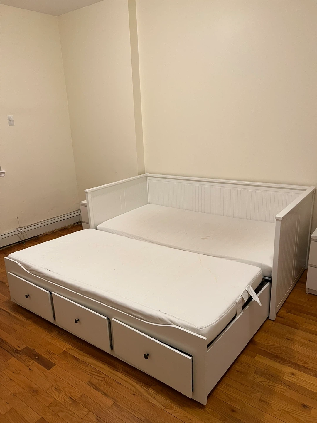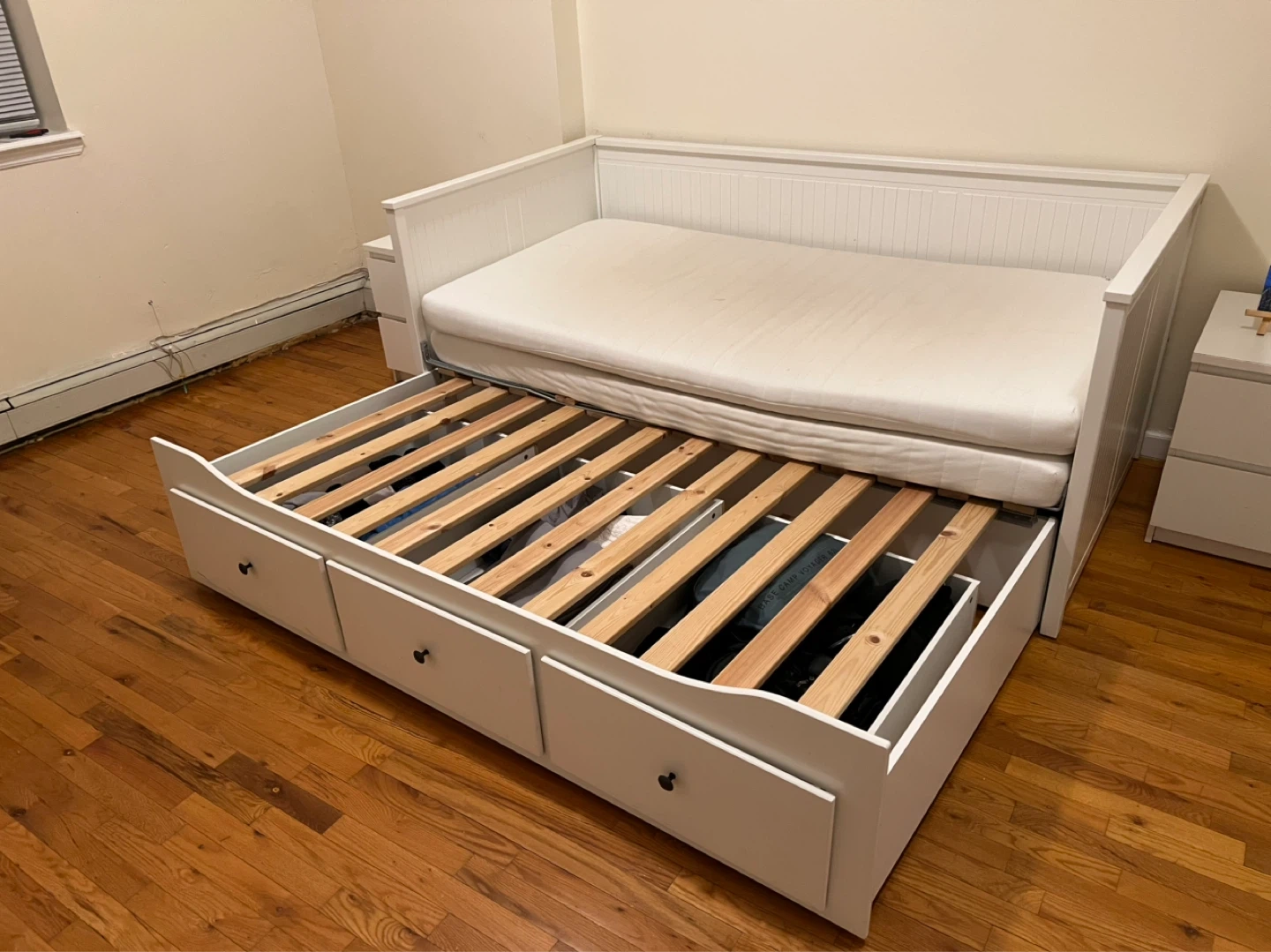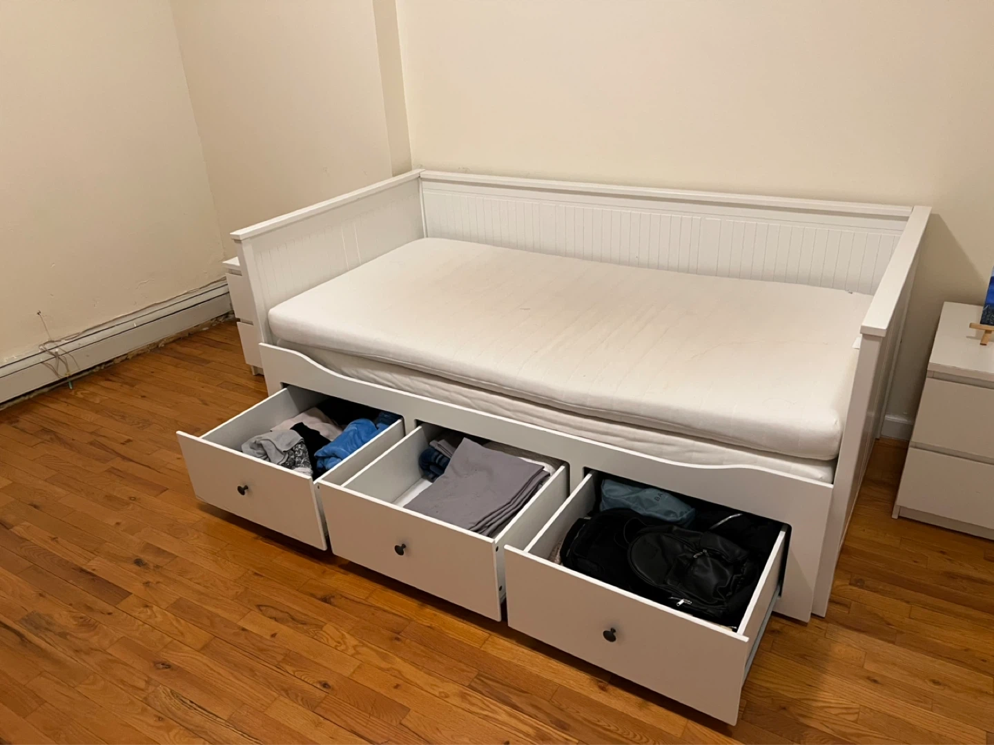 This white daybed offers a comfortable seating and sleeping solution. It features three spacious drawers built into its base for convenient storage. The bed frame is white with a slatted support system.
