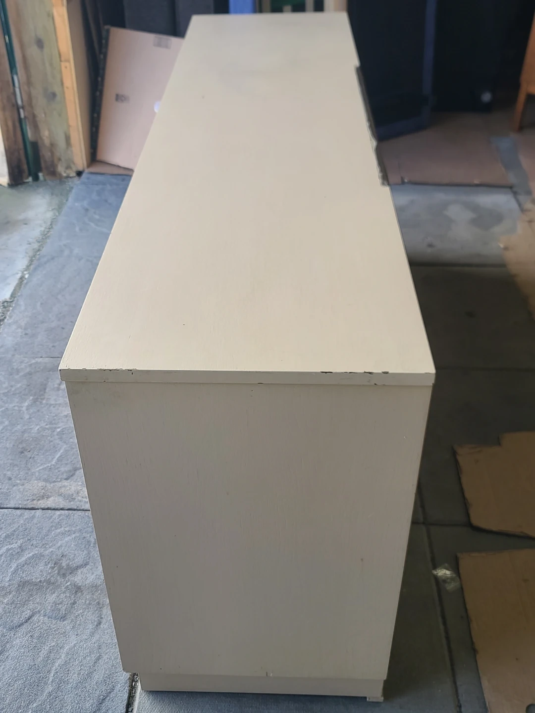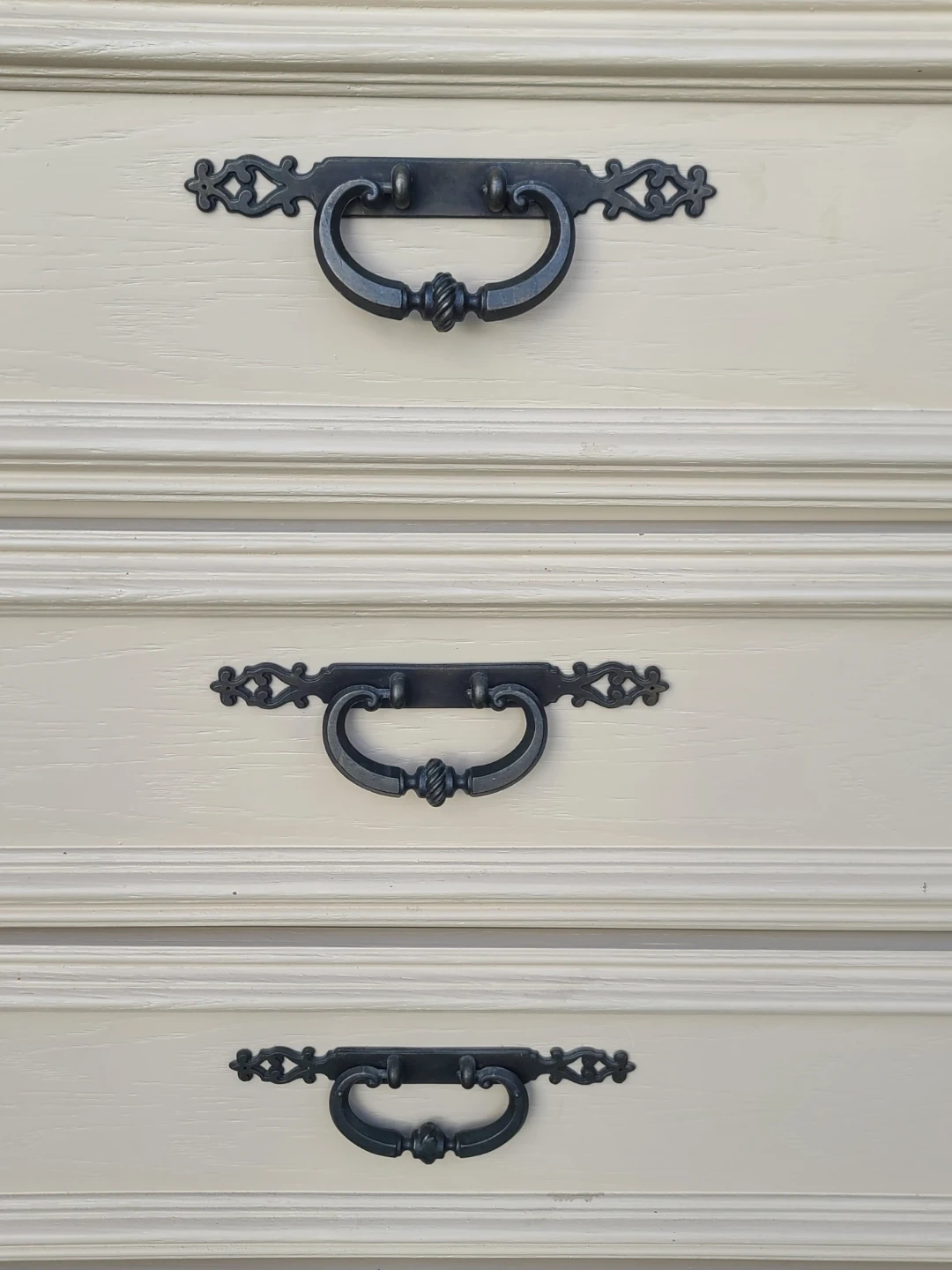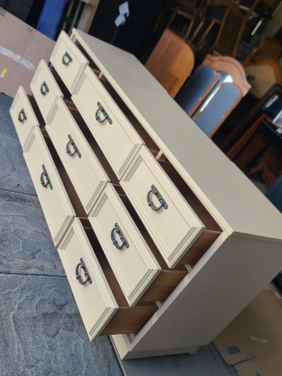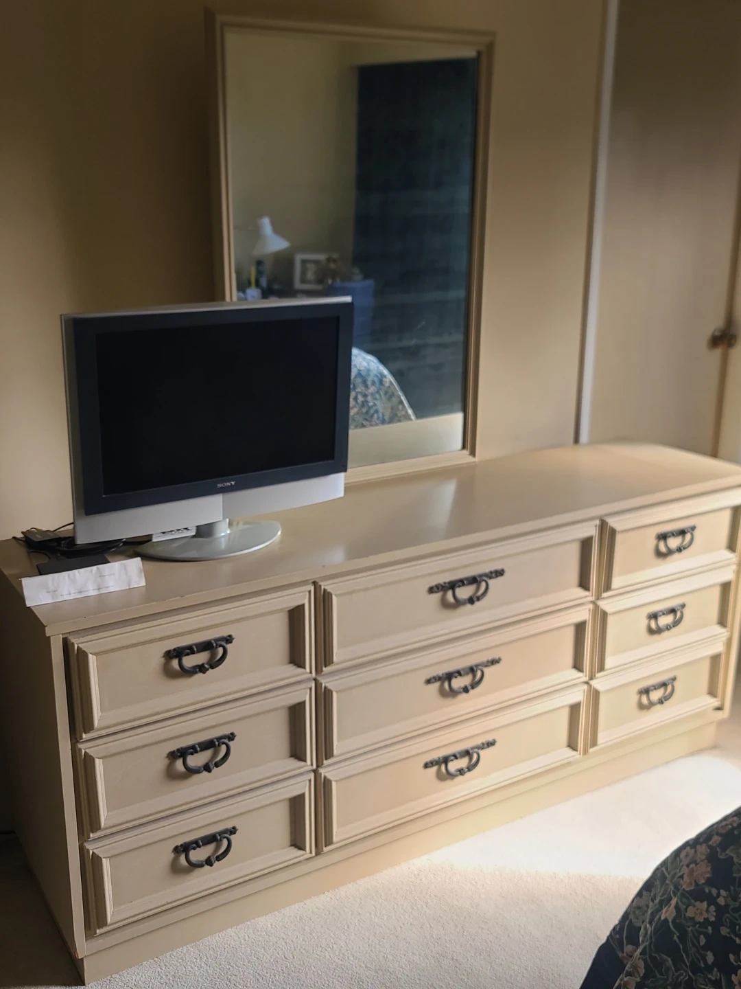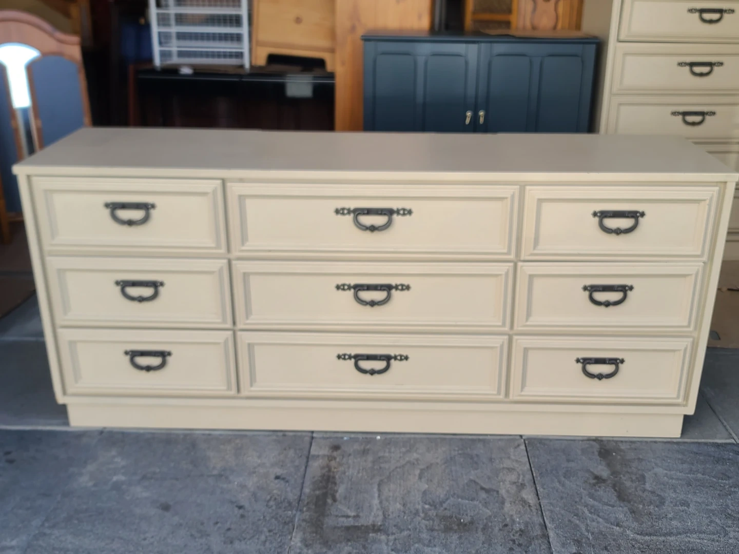 Sturdy wooden dresser has nine drawers with ornate dark metal pulls. Cream finish is neutral and versatile. Set includes a matching large rectangular mirror that mounts to the back. Drawers have wood interiors and slide smoothly. Measurements: W 72" X D 18 1/2" X H 31". Delivery can be arranged. Viewing and pickup by appointment.