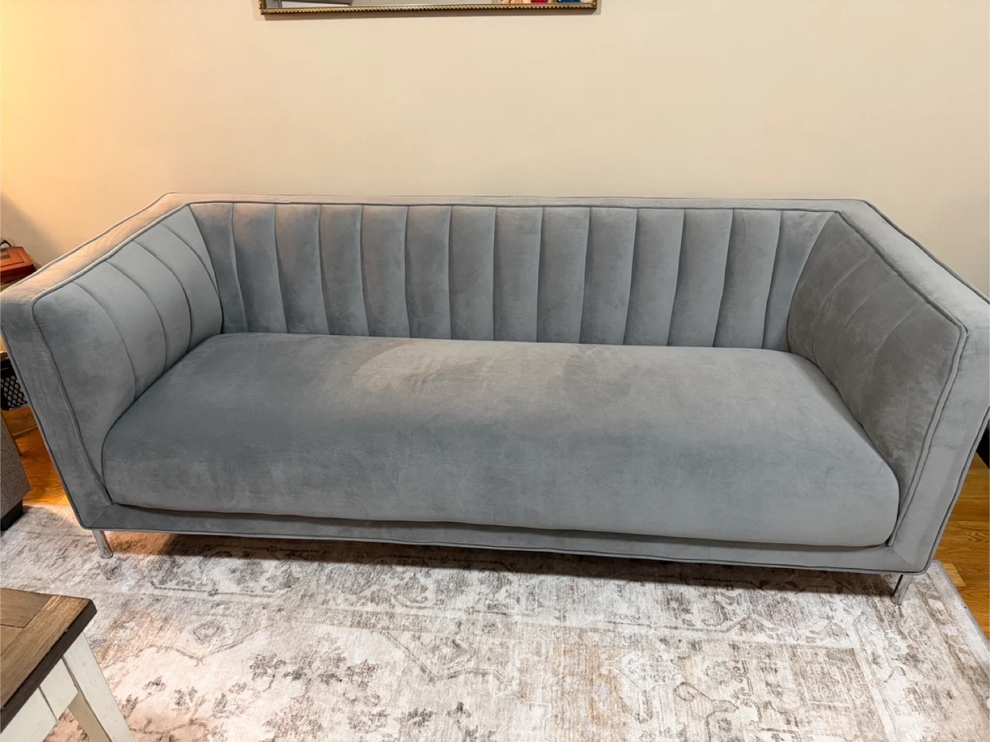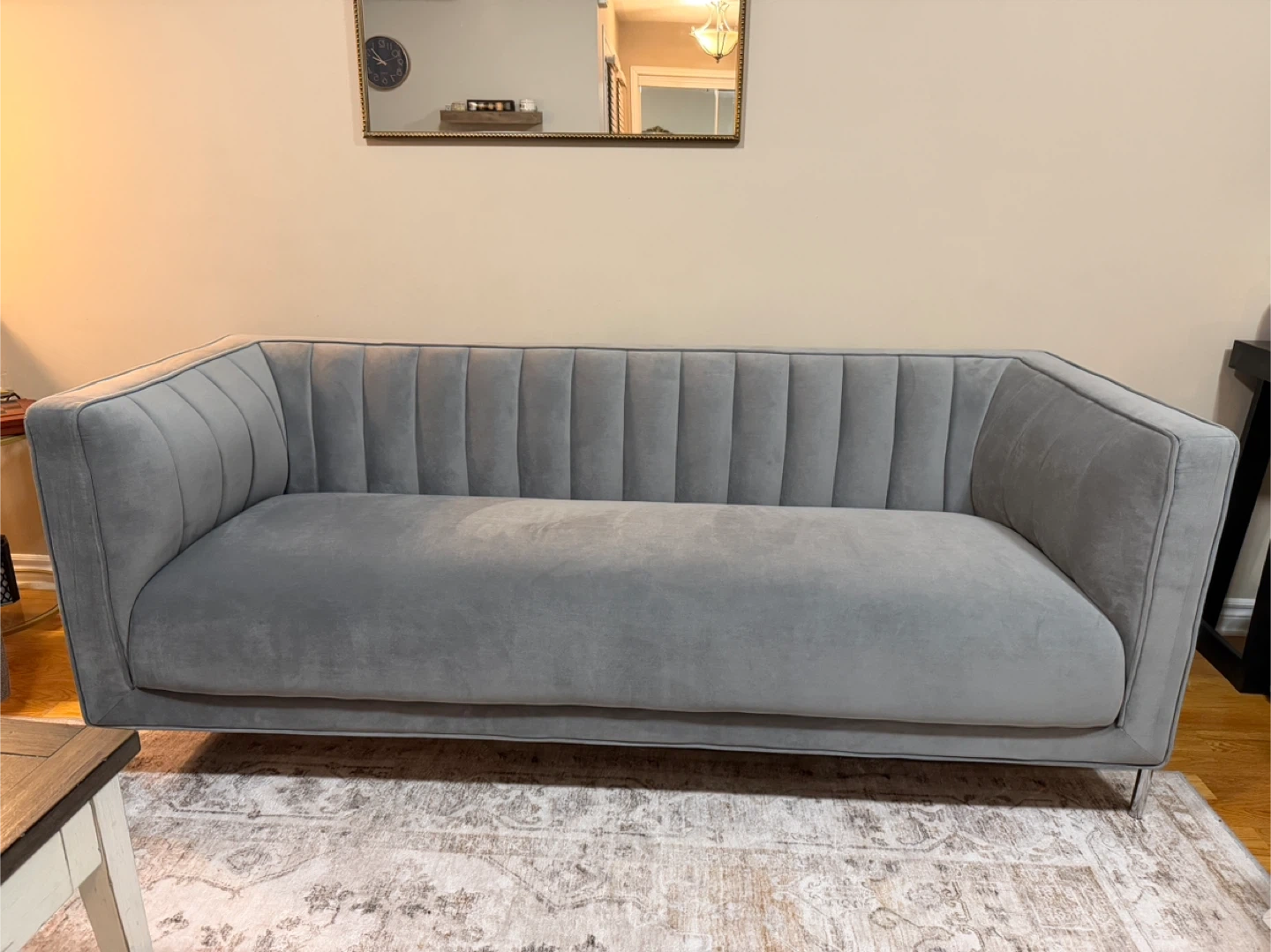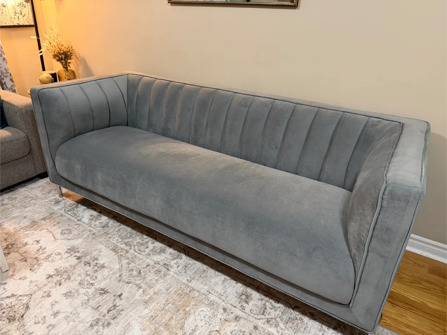 Beautiful light grey velvet fabric with an elegant channel-tufted back and sleek chrome metal legs. Very stylish and comfortable perfect for a living room, condo, apartment, or office.