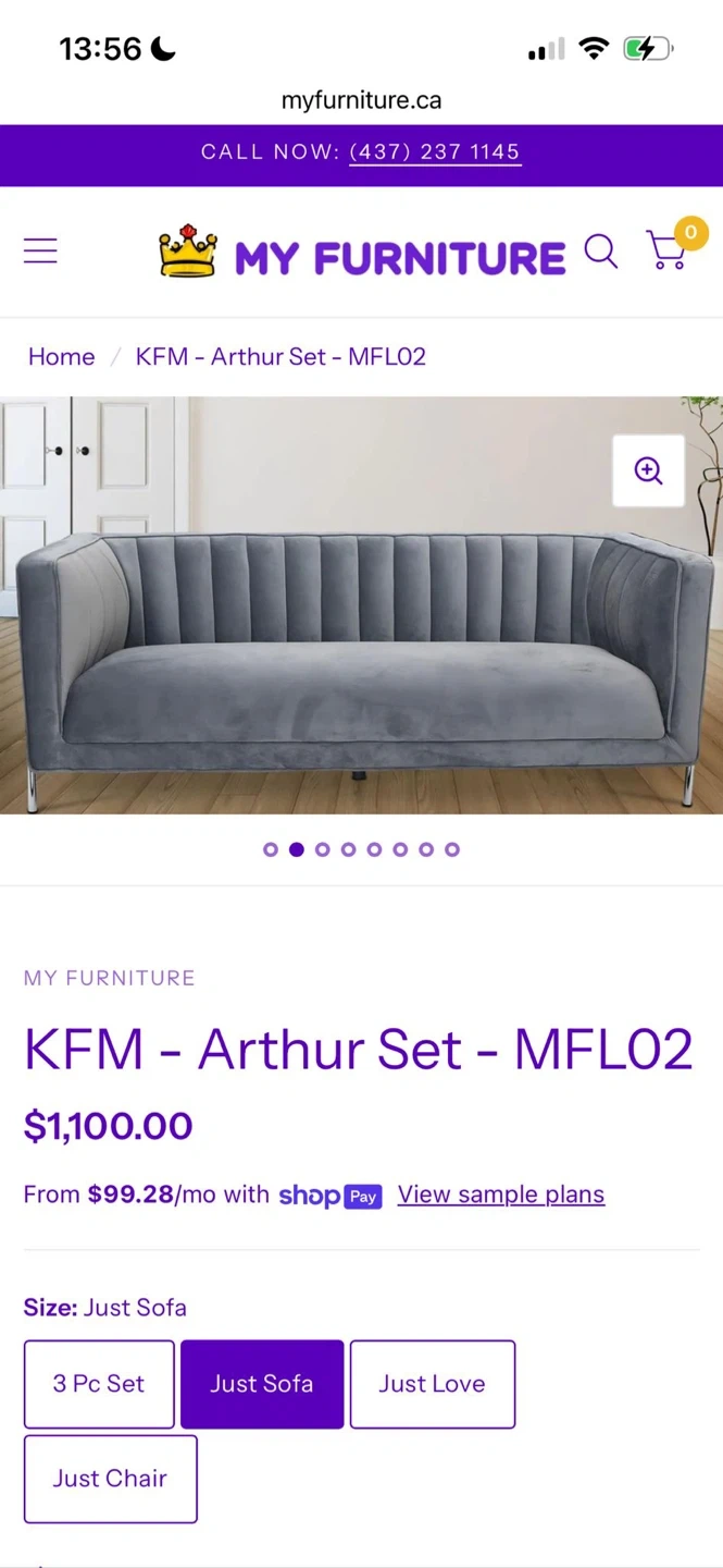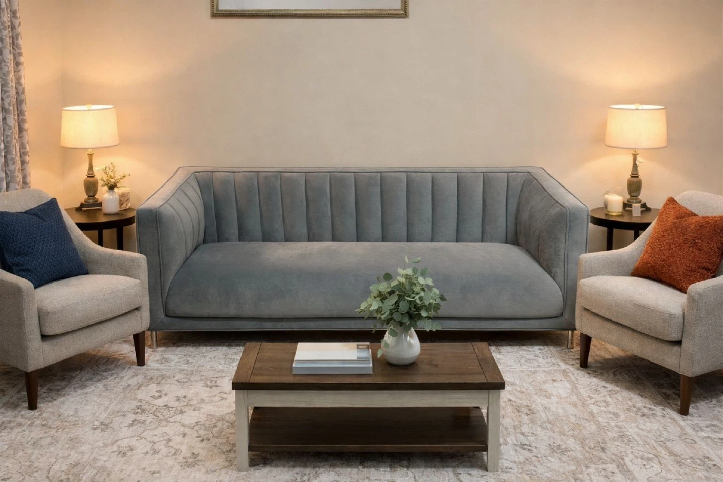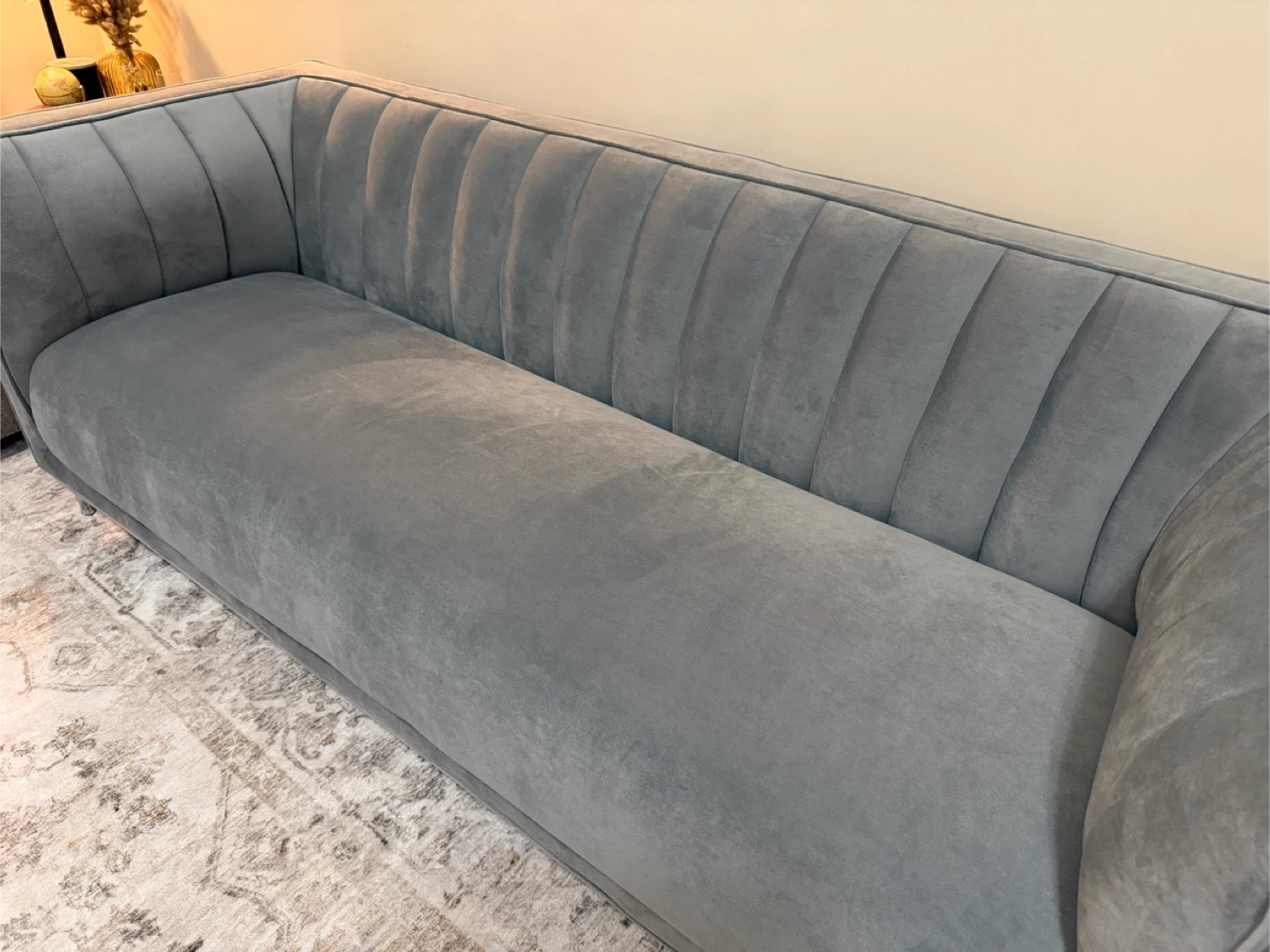 Beautiful light grey velvet fabric with an elegant channel-tufted back and sleek chrome metal legs. Very stylish and comfortable perfect for a living room, condo, apartment, or office.