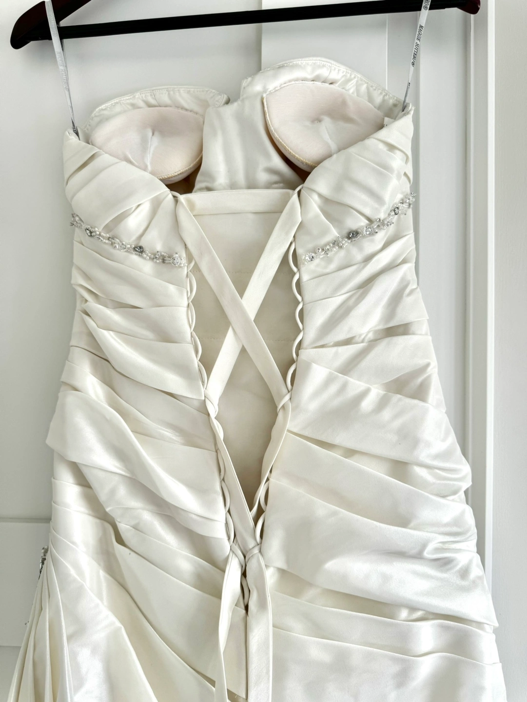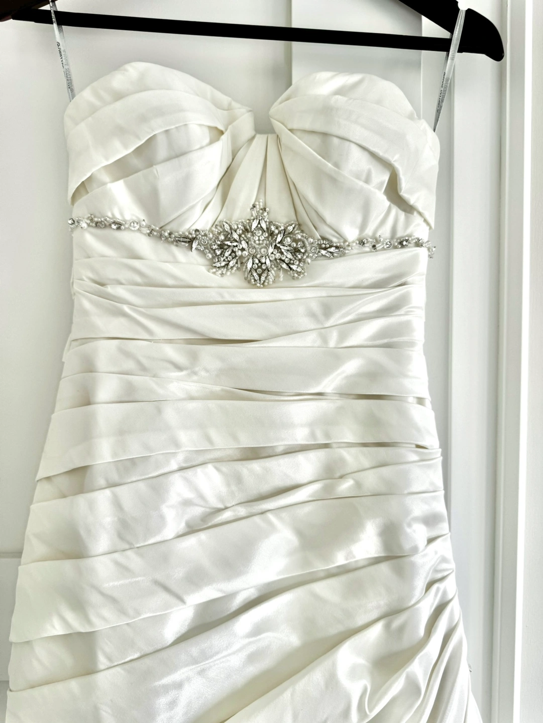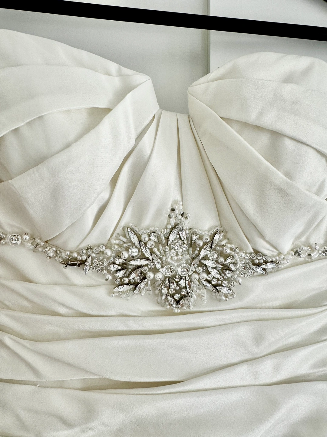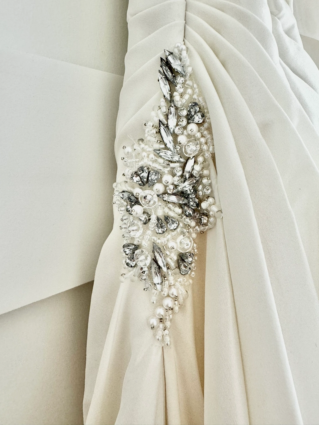 Ruched bodice extends into glamorous asymmetrical draping throughout the skirt.