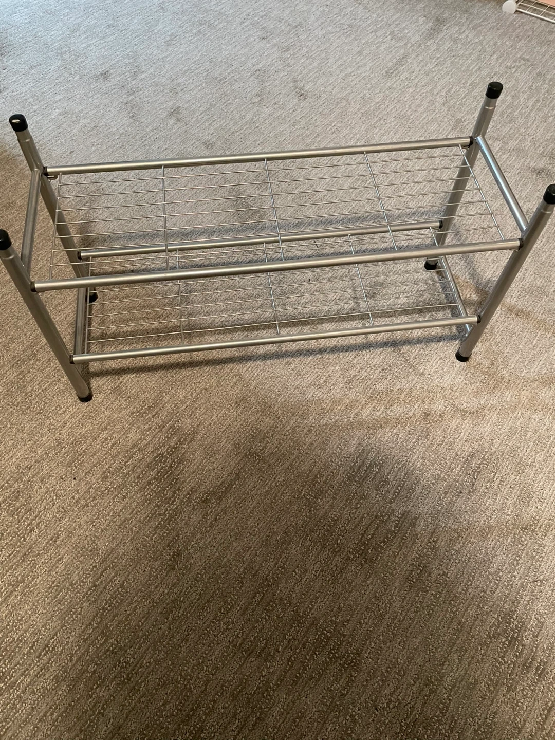 This is a two-tier shoe rack made from metal. It's a simple and functional way to store your footwear. The wire shelves allow for good air circulation.