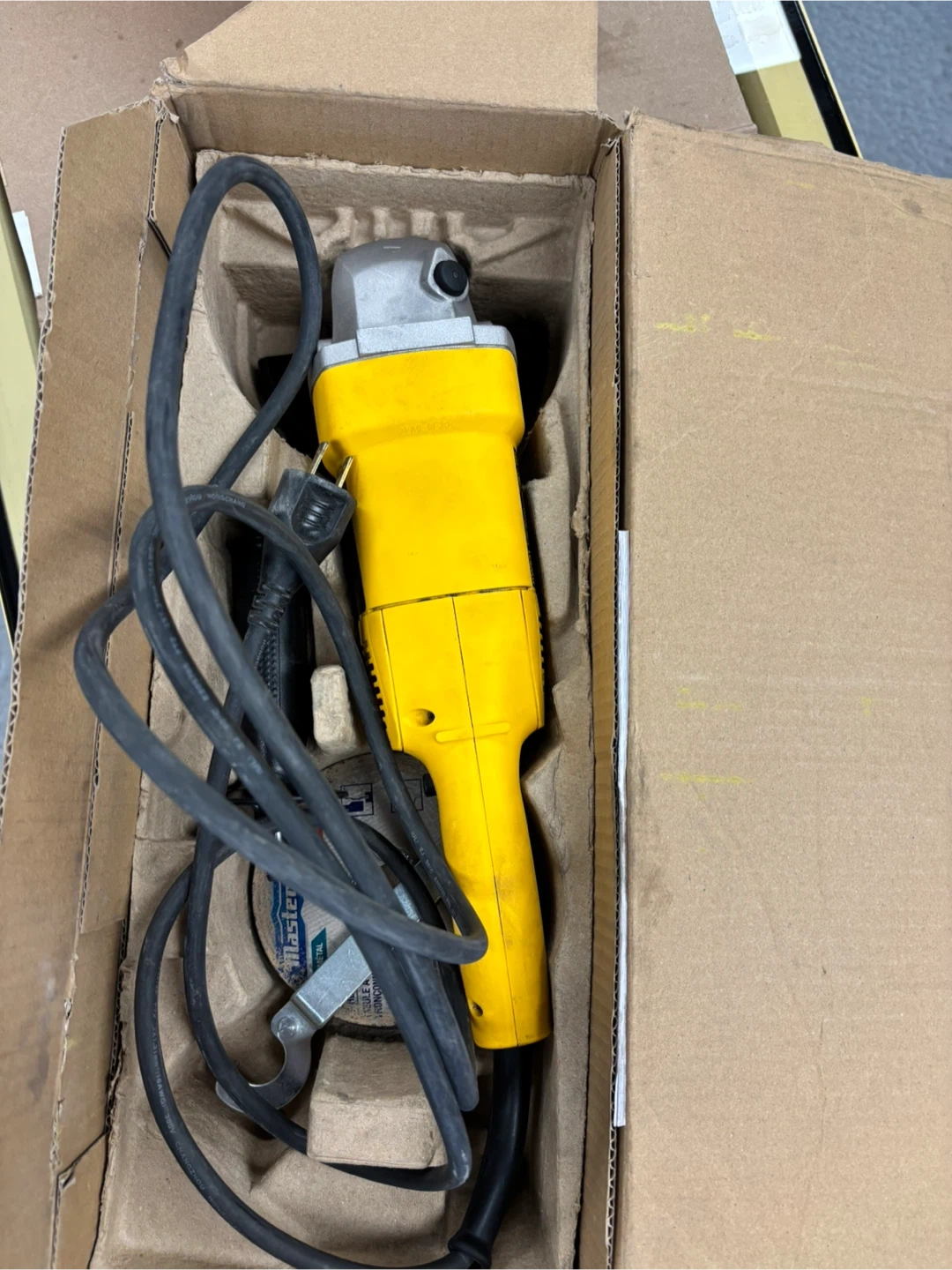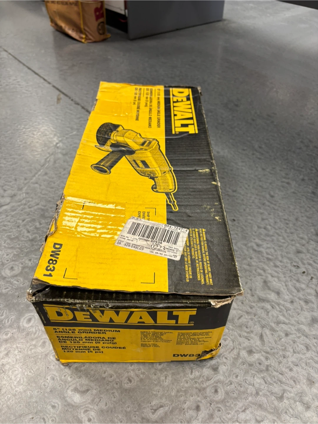 DEWALT DW831 angle grinder with a 5 inch (125 mm) cutting disc size. Comes in original box with protective packaging. This tool is designed for grinding and cutting applications.