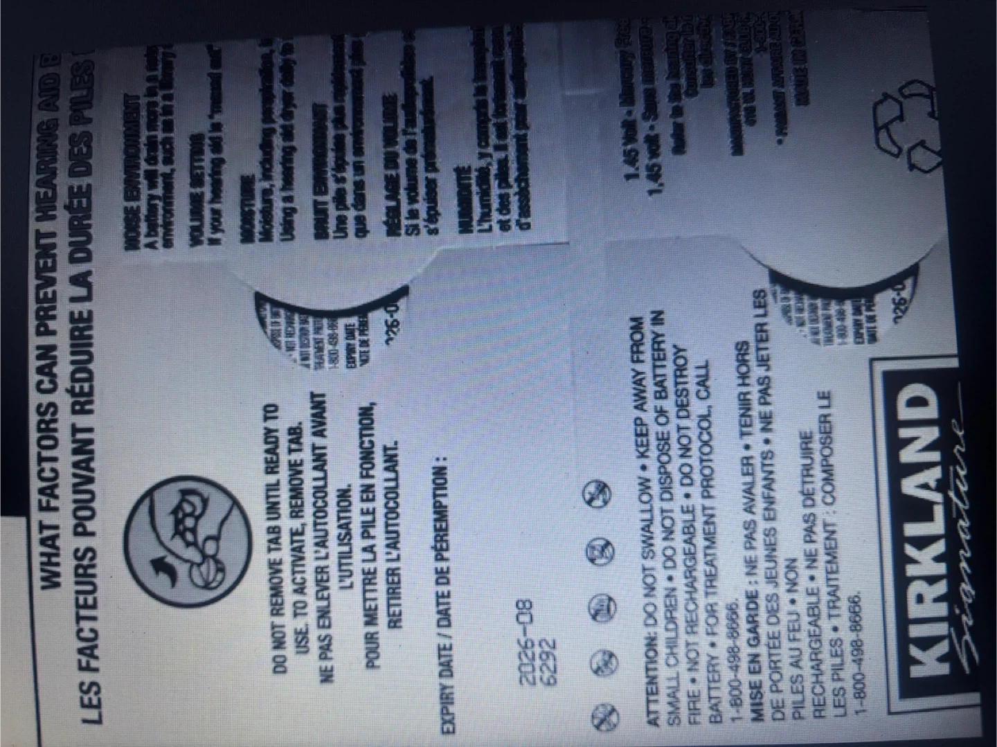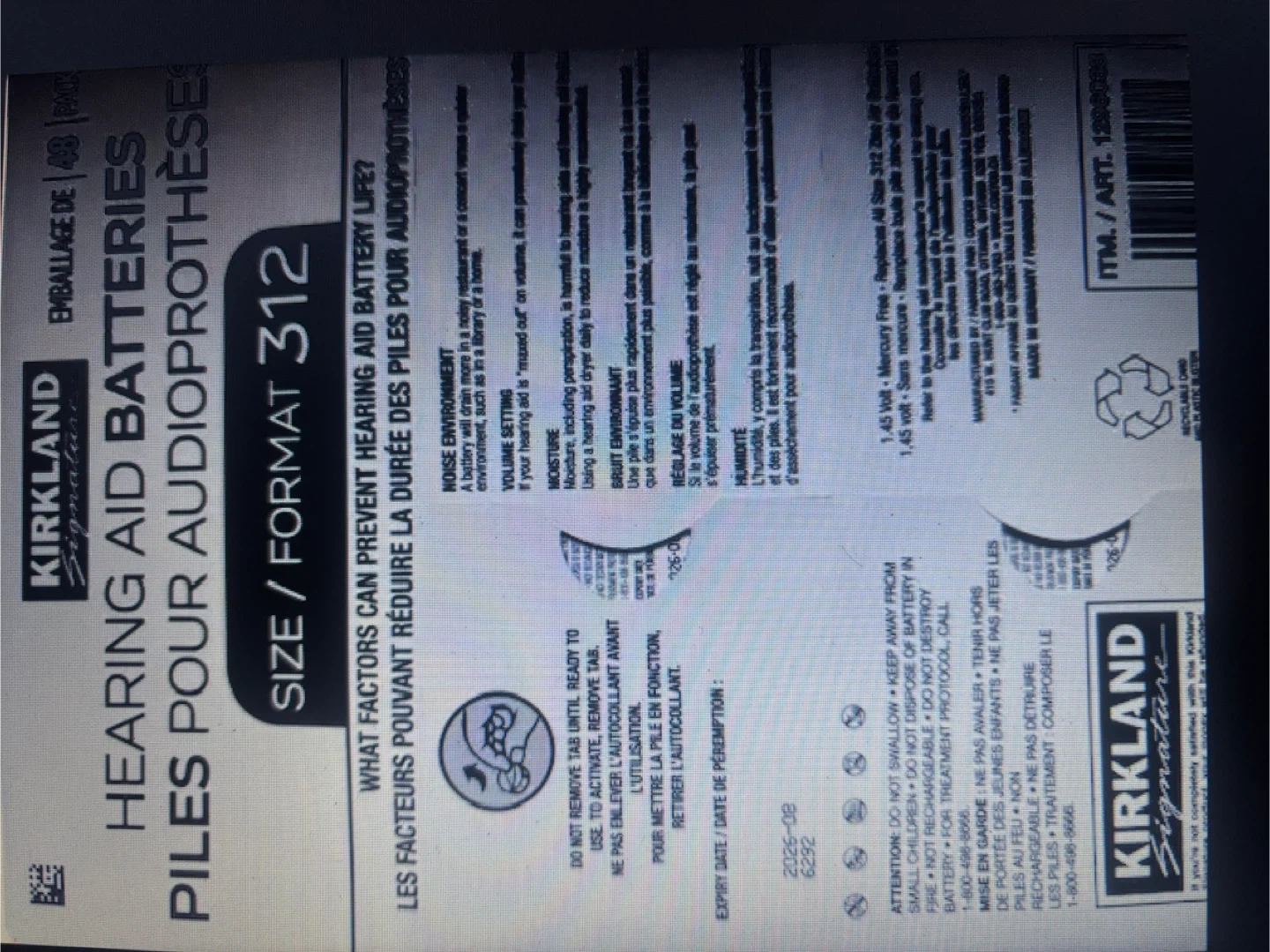 Kirkland Signature hearing aid batteries, size 312. This pack contains 48 batteries. Expiry date is 2026-08.