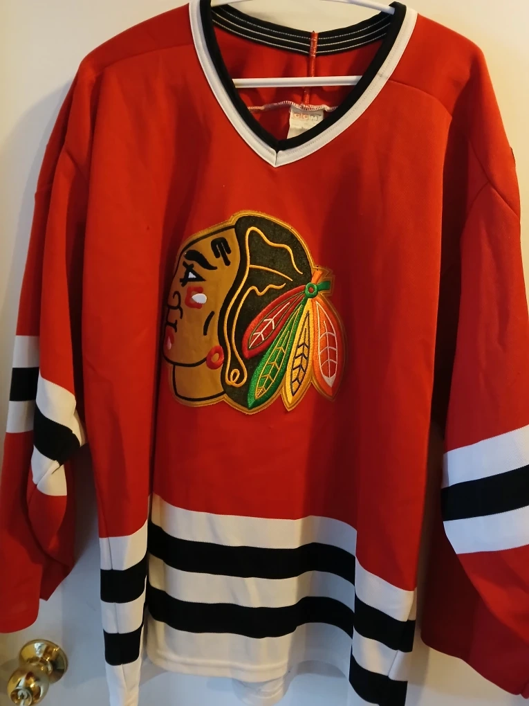 This is a Lge CCM Chicago Blackhawks hockey jersey. It's red with the team's logo on the front. The jersey has stripes on the sleeves and hem. It's a classic fan apparel item!