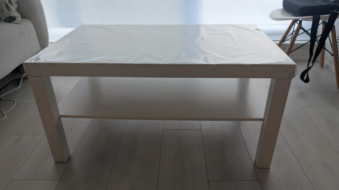 This is a white coffee table with a built-in shelf for extra storage. Its simple design makes it versatile for any living space. It's a great addition for keeping your living room tidy and stylish.