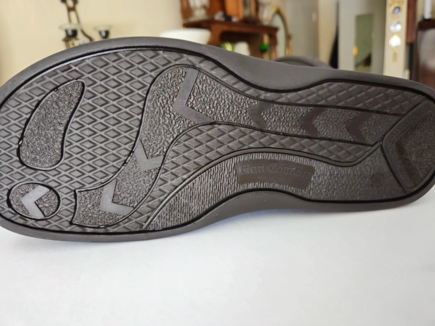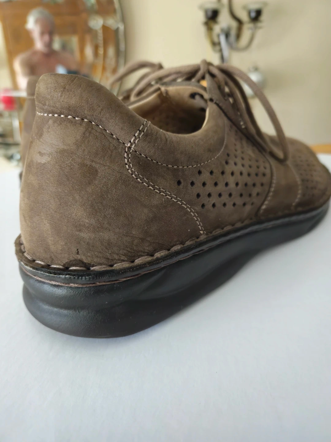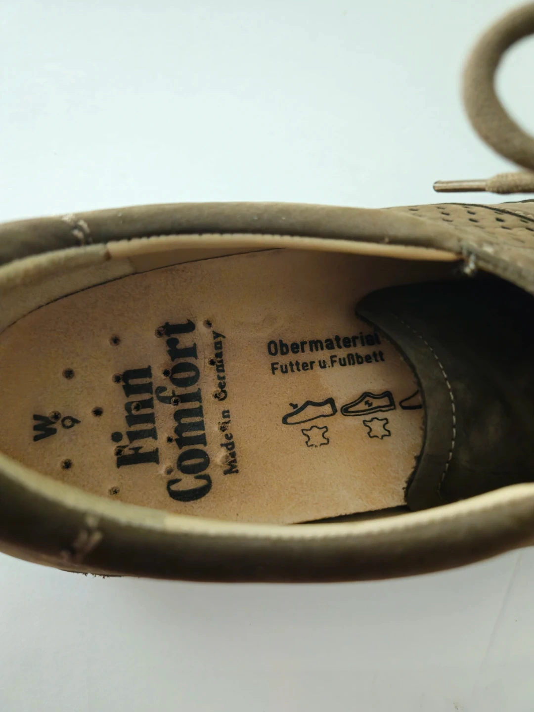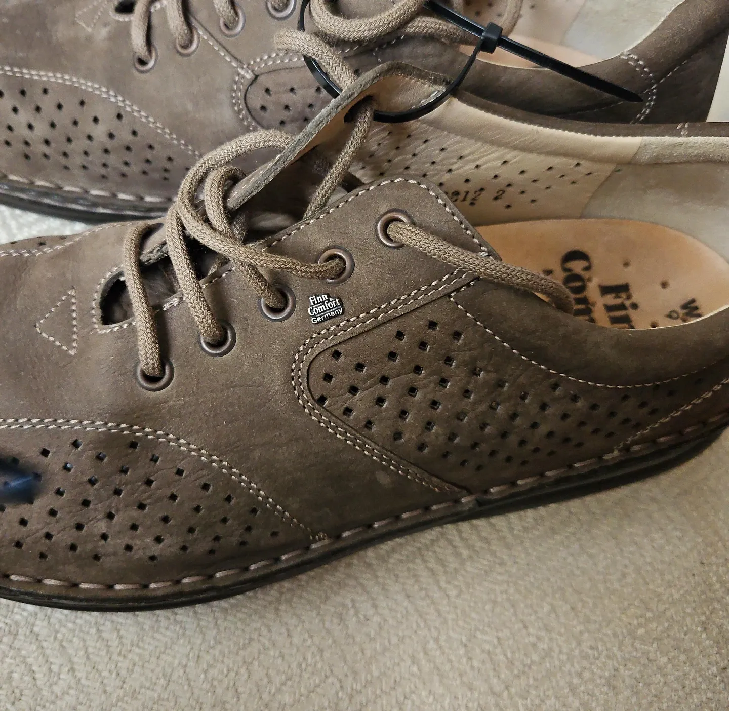 Finn Comfort shoes made in Germany. These brown suede shoes feature perforations for breathability and a lace-up closure. They have a 'Shock Absorb' sole.
