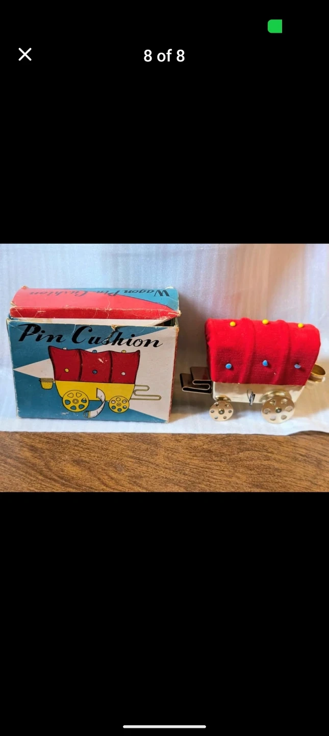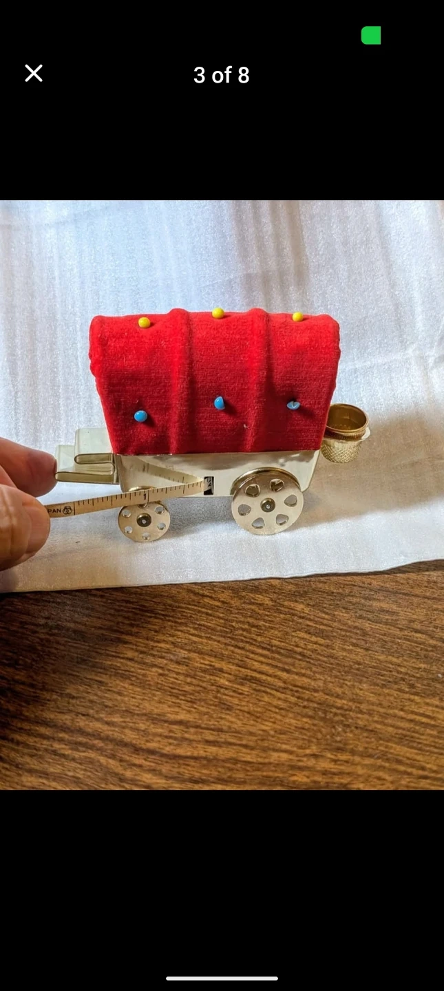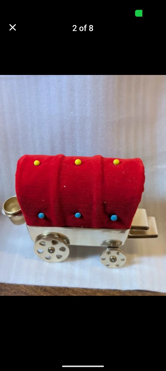 This is a rare cute wagon-shaped pin cushion. It's made with a red velvet material for the wagon cover and has colorful decorative pins. A small gold-tone thimble holder is attached to the back. Includes the original box, which says "Pin Cushion Wagon Pin Cushion".
