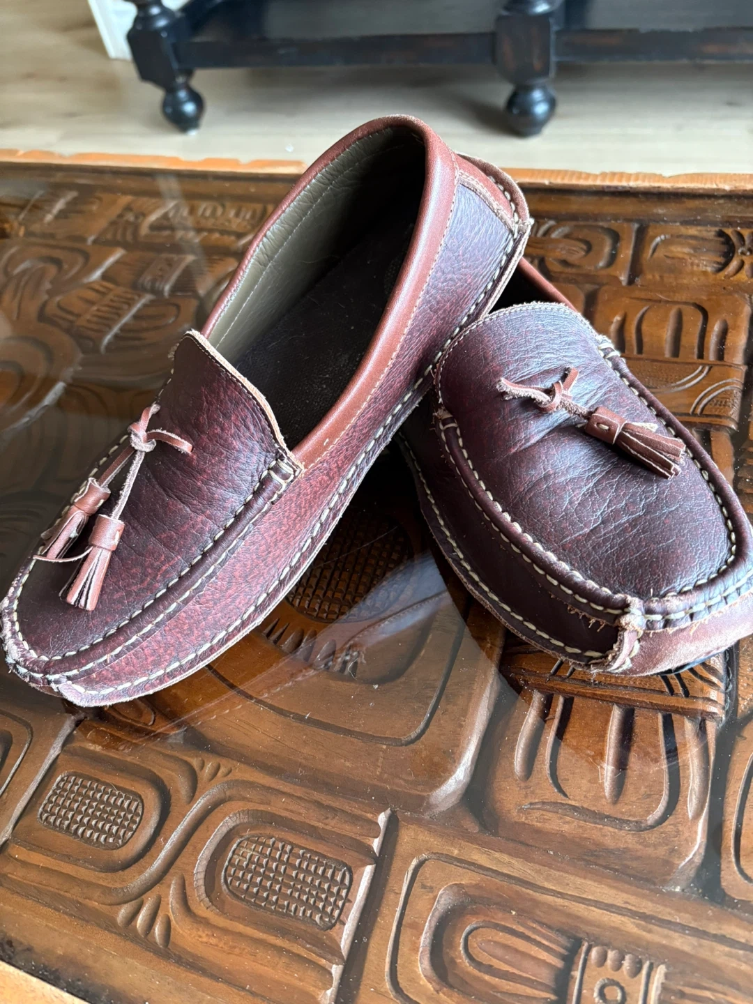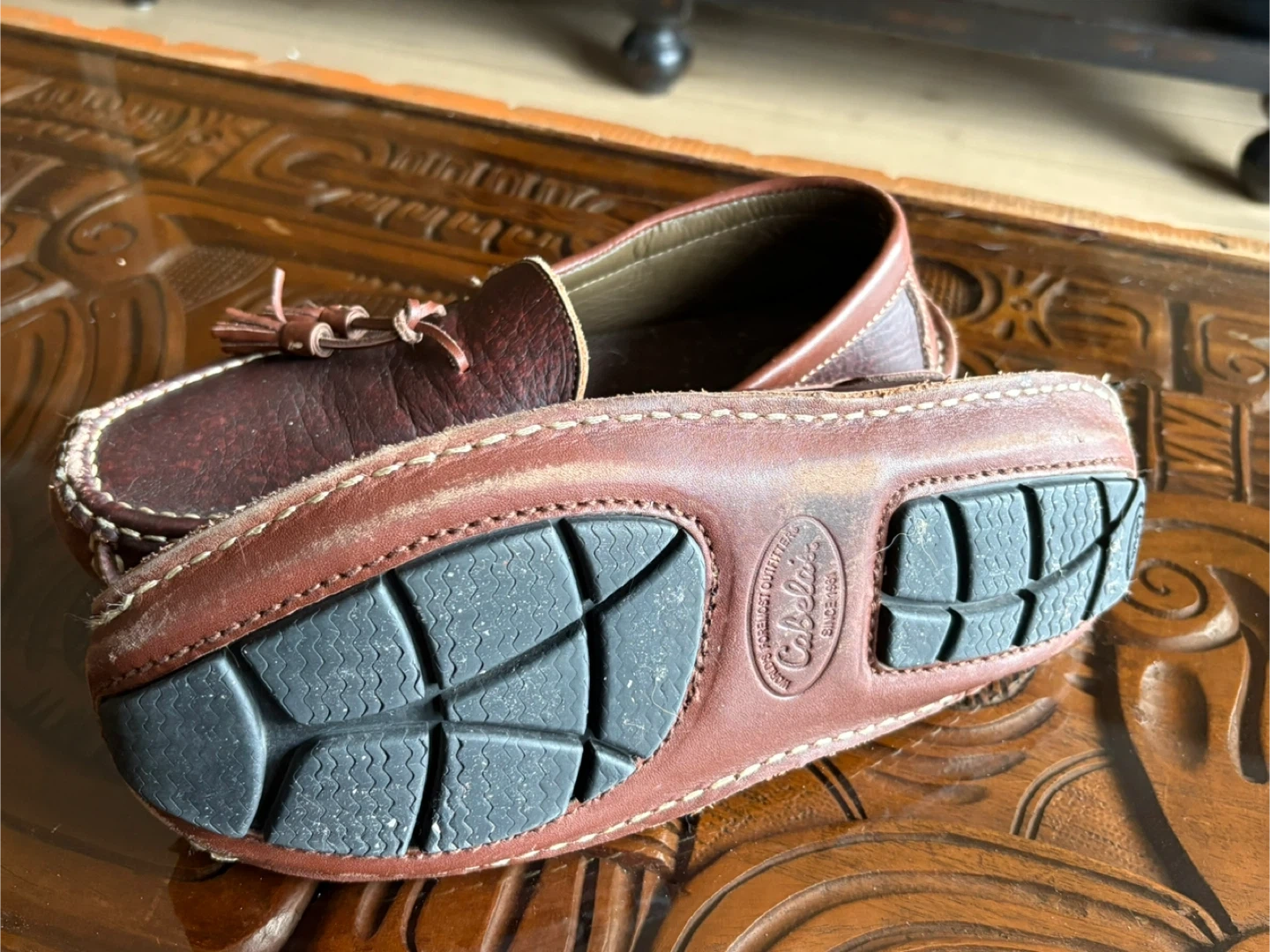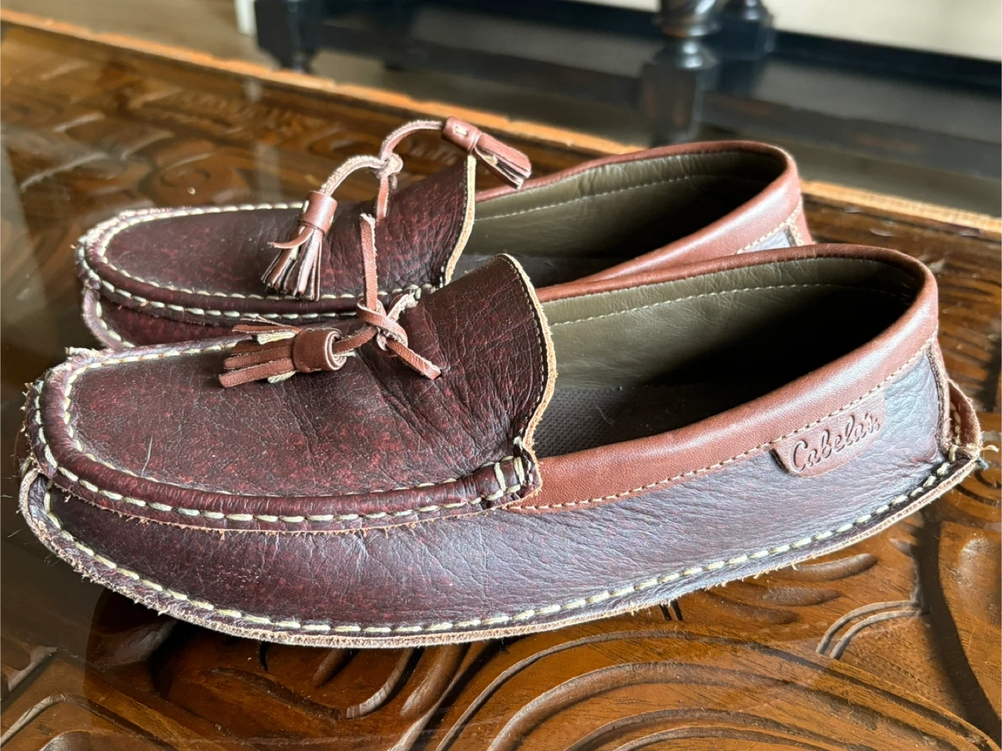 These Cabela's men's driving moccasins are made of genuine leather. They feature a classic loafer style with tassels. The rubber sole provides good grip.