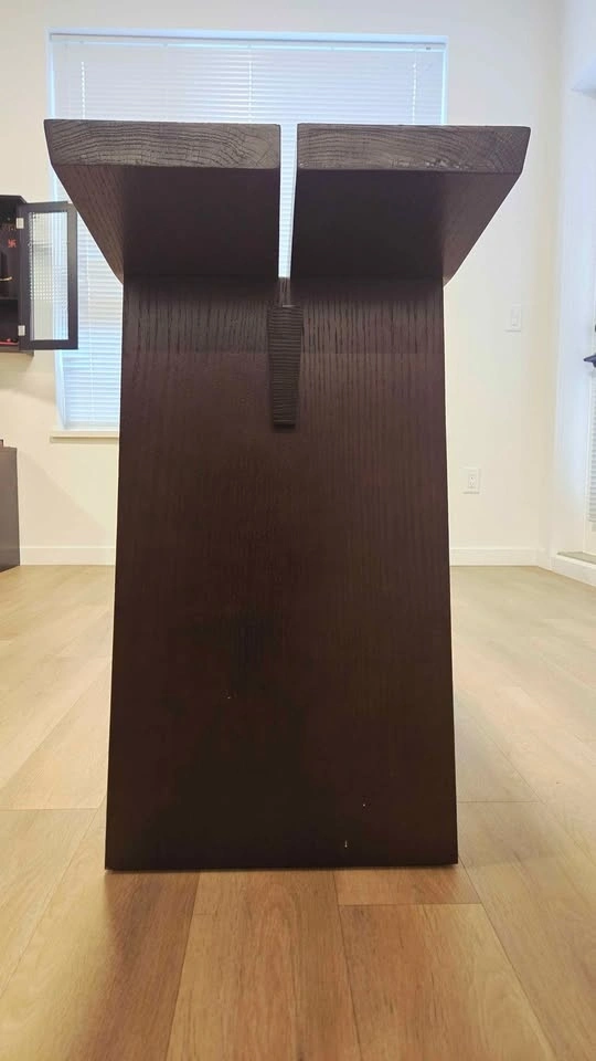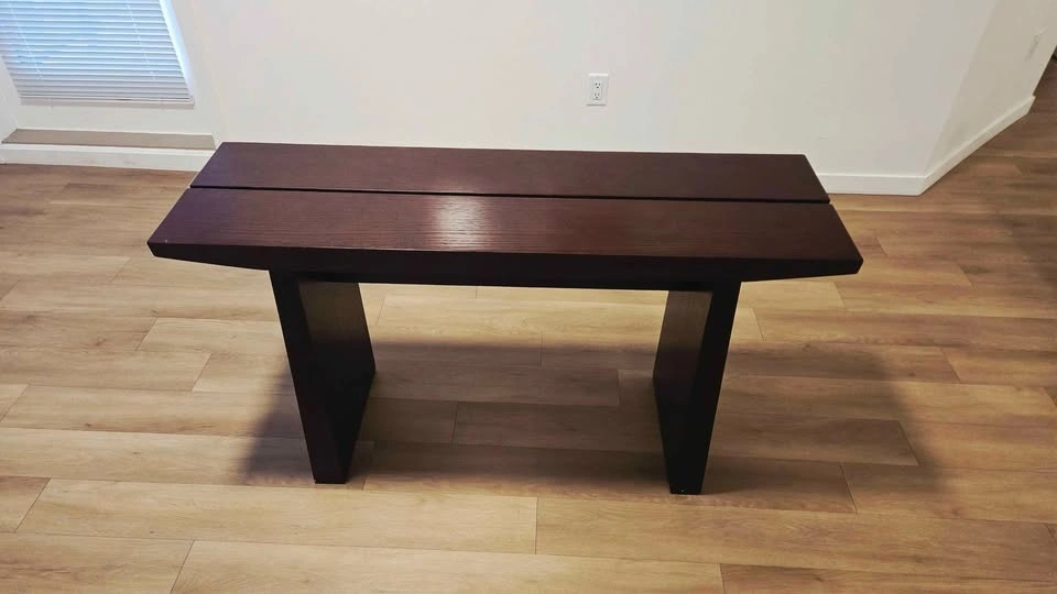 In great shape. A stylish dark wood bench with a modern design. It's made from solid wood and features a rich, deep finish. This bench would fit well in an entryway or as a sofa table. 16” x 52” x 29” high.