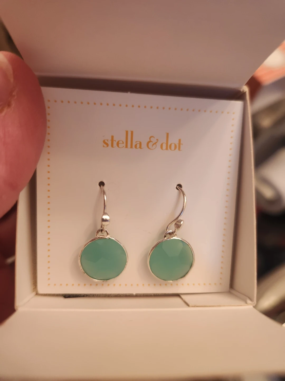 These Stella & Dot earrings feature round teal stones set in silver-tone metal. They're classic drop style earrings. They'd make a lovely addition to any jewellery collection!