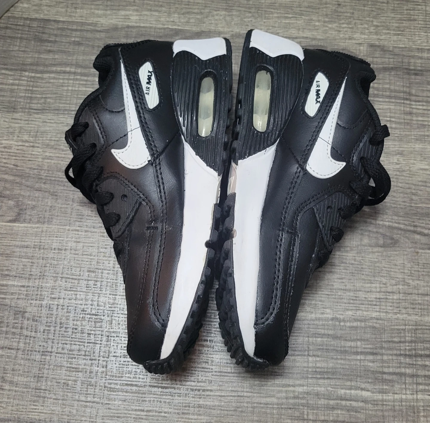 Nike Air Max 90 sneakers in black and white. US Youth size 2Y. Leather and synthetic upper. Rubber sole with Air Max cushioning.