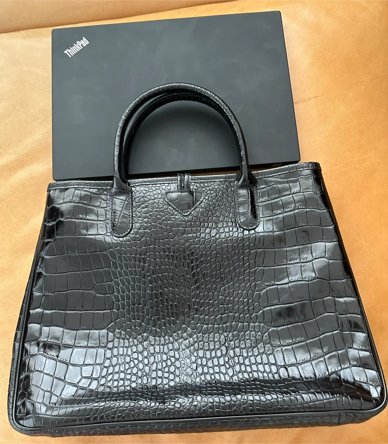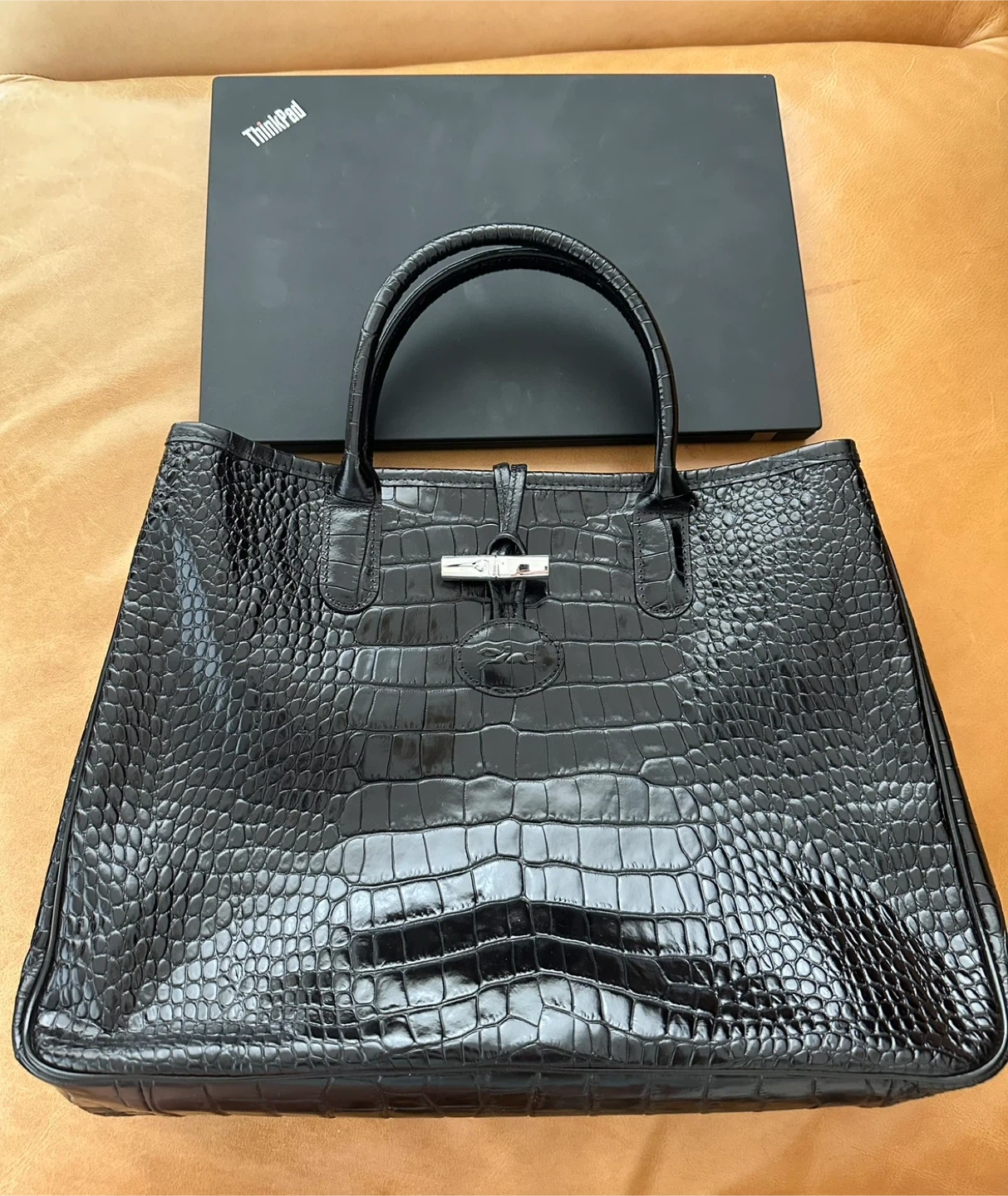 Longchamp Black Crocodile Embossed Leather Roseau Tote .This black tote bag features a sleek, embossed leather finish. It's spacious and stylish for everyday use. The bag has sturdy handles and a secure closure.
