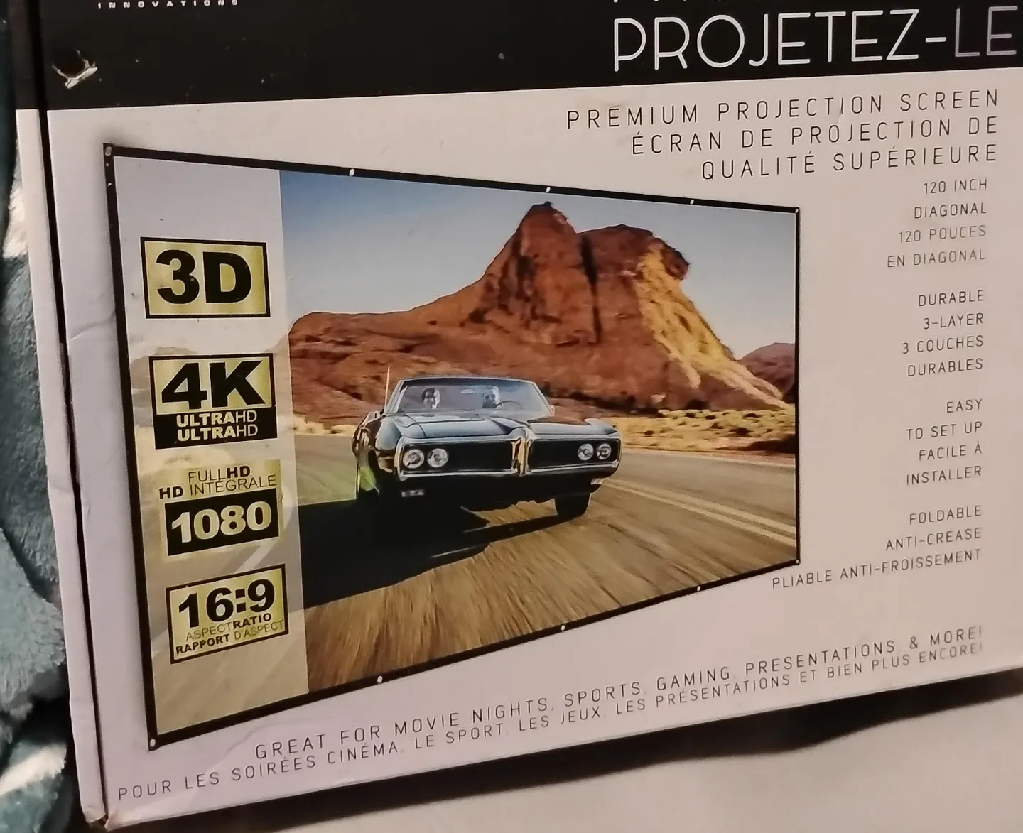 This is a premium projection screen that's 120 inches diagonally. It's a 3-layer, durable, anti-crease material that's easy to set up. It has a 16:9 aspect ratio and supports 3D, 4K, and Full HD 1080p resolutions.