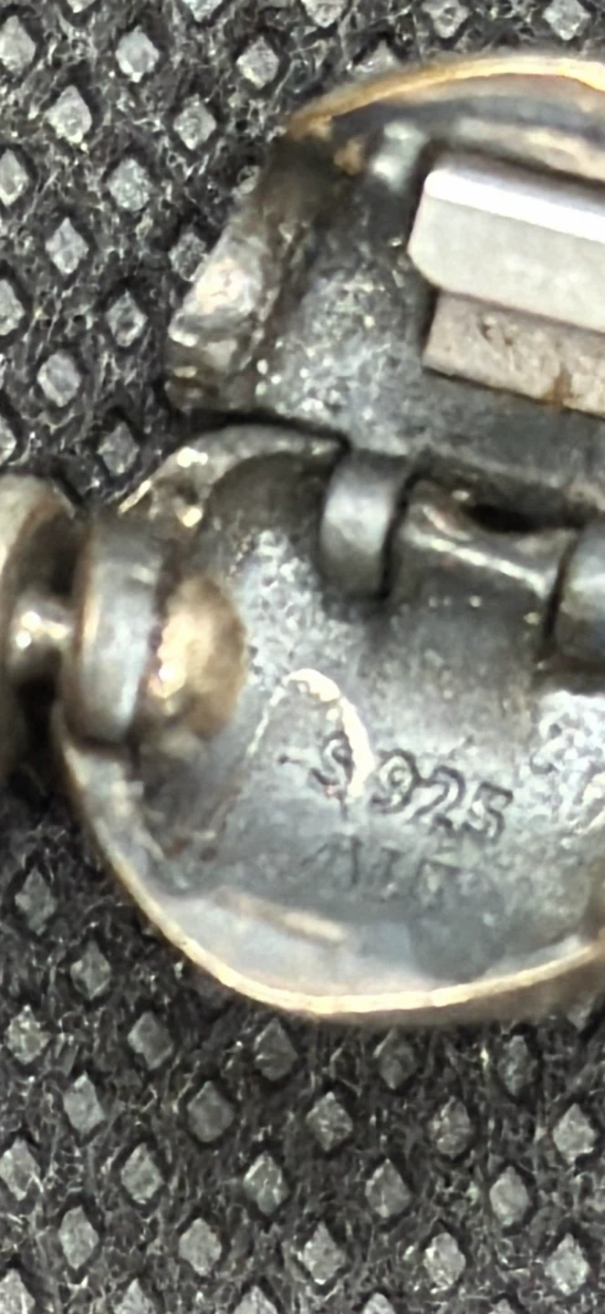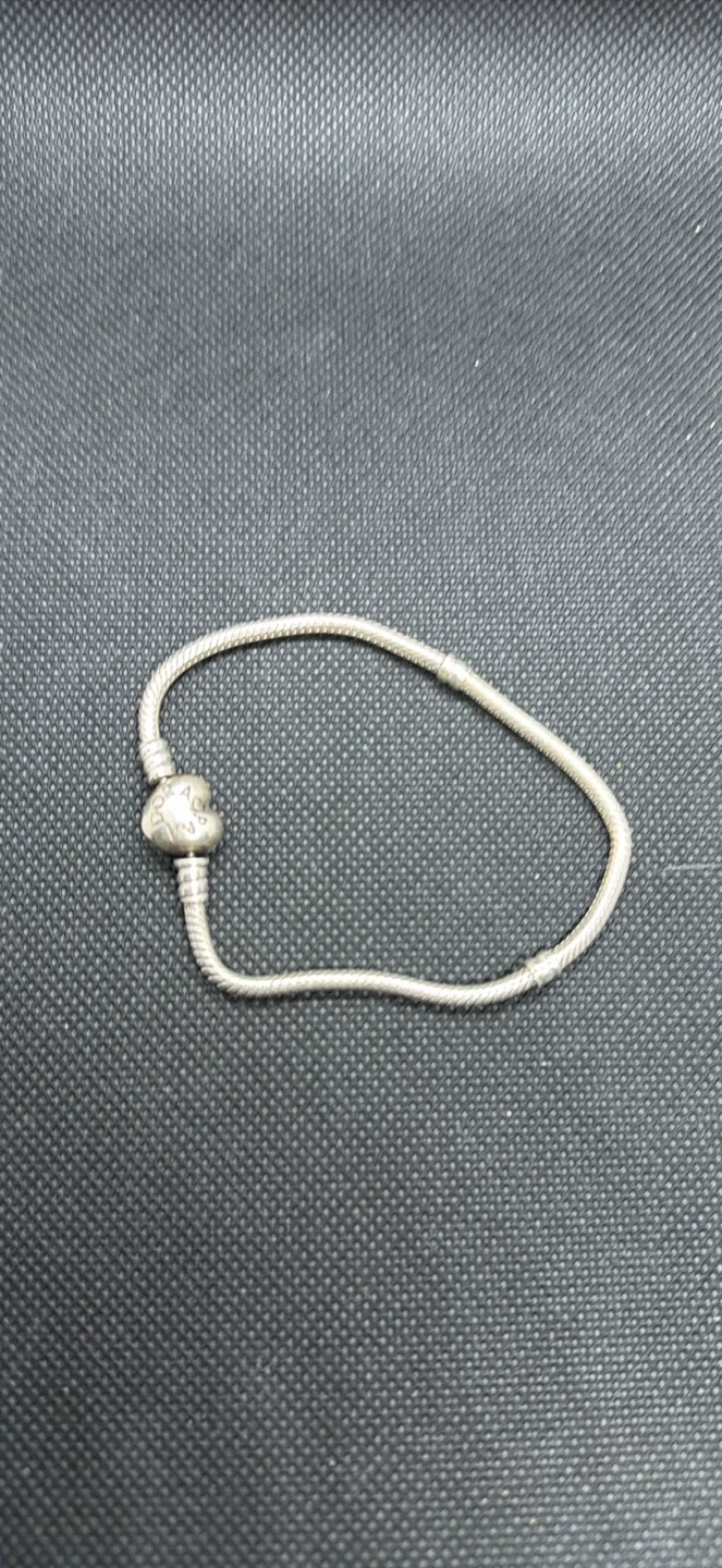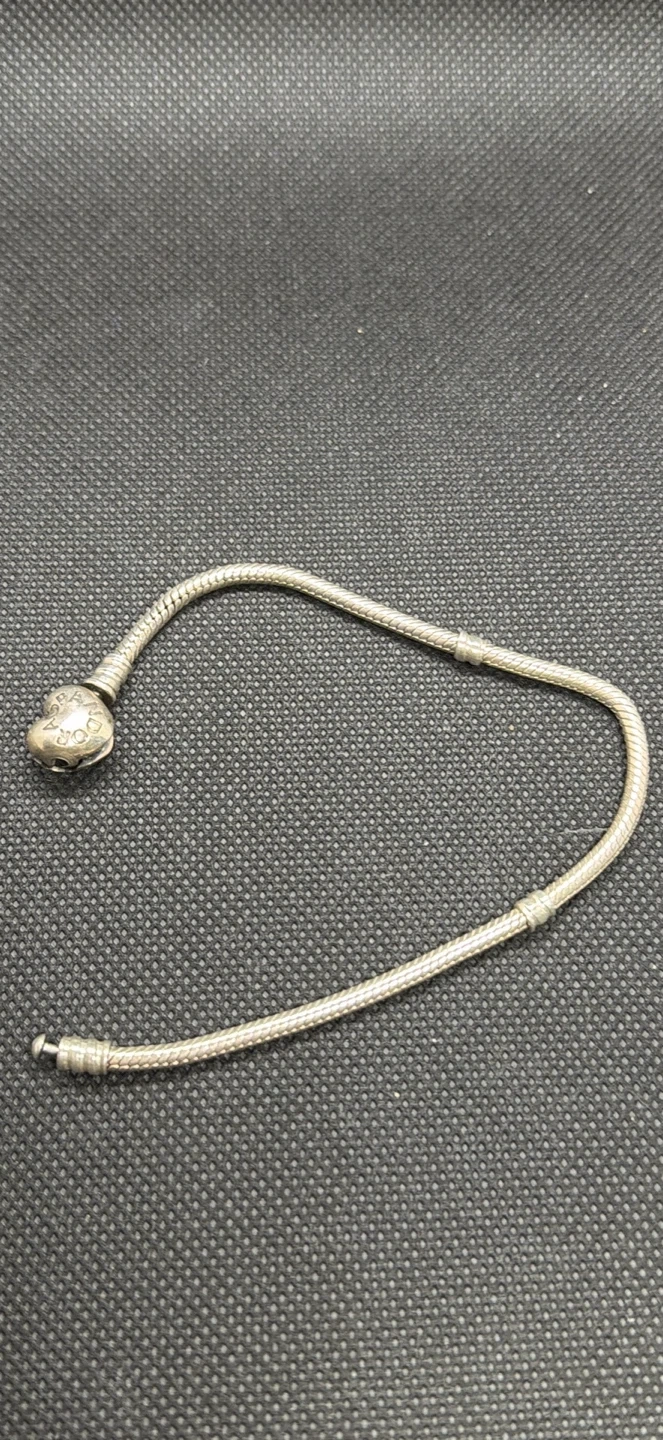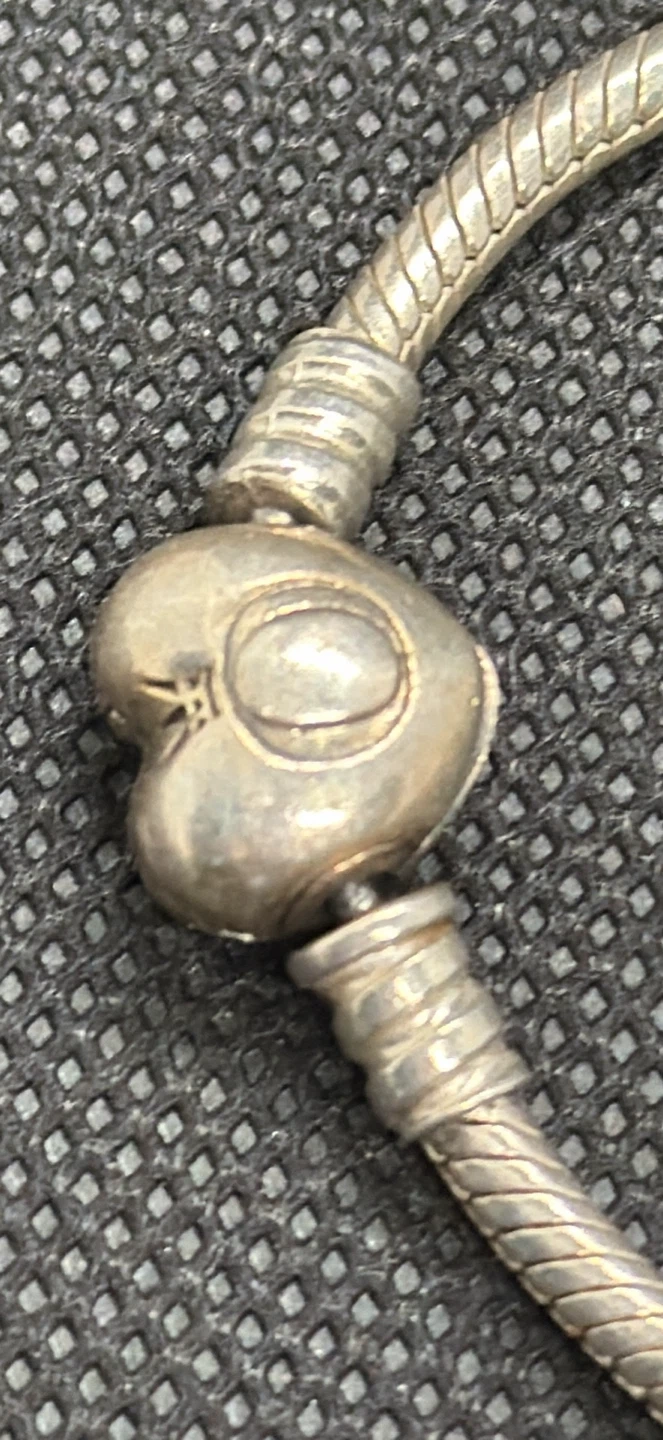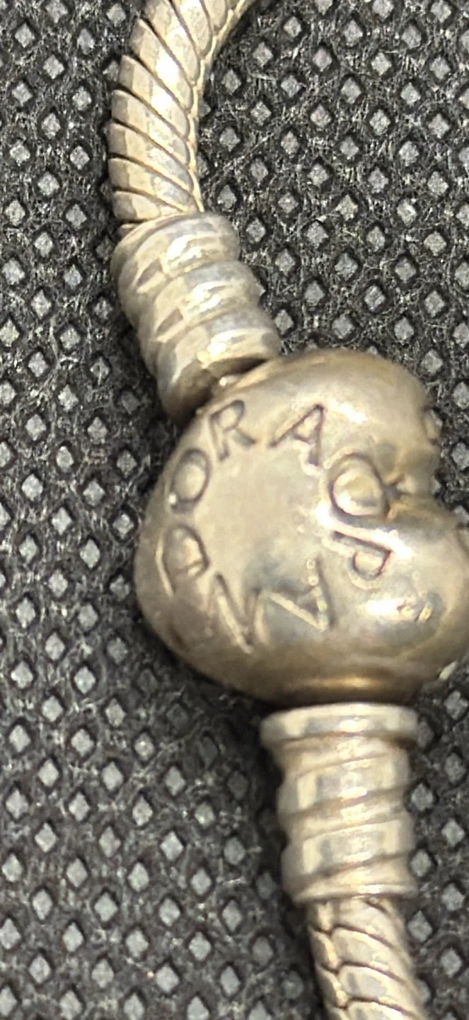 This is a Pandora sterling silver charm bracelet. It's stamped with "925" for sterling silver. The clasp is detailed with the Pandora logo.