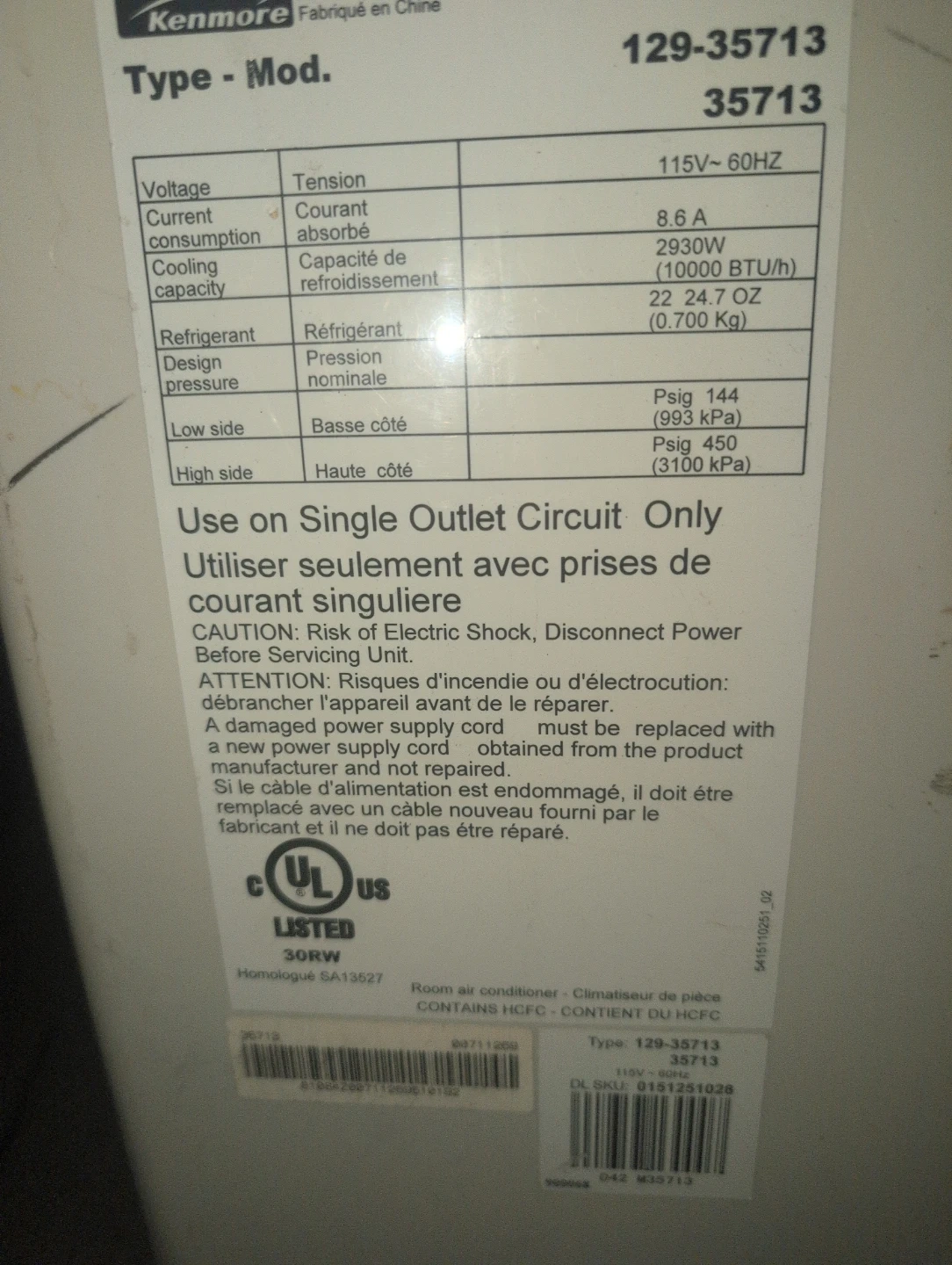This is a Kenmore portable air conditioner, model 129-35713. It has a cooling capacity of 10000 BTU/h. It's designed for single outlet circuits. Perfect for cooling a room on a hot day!