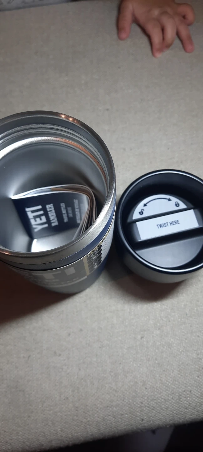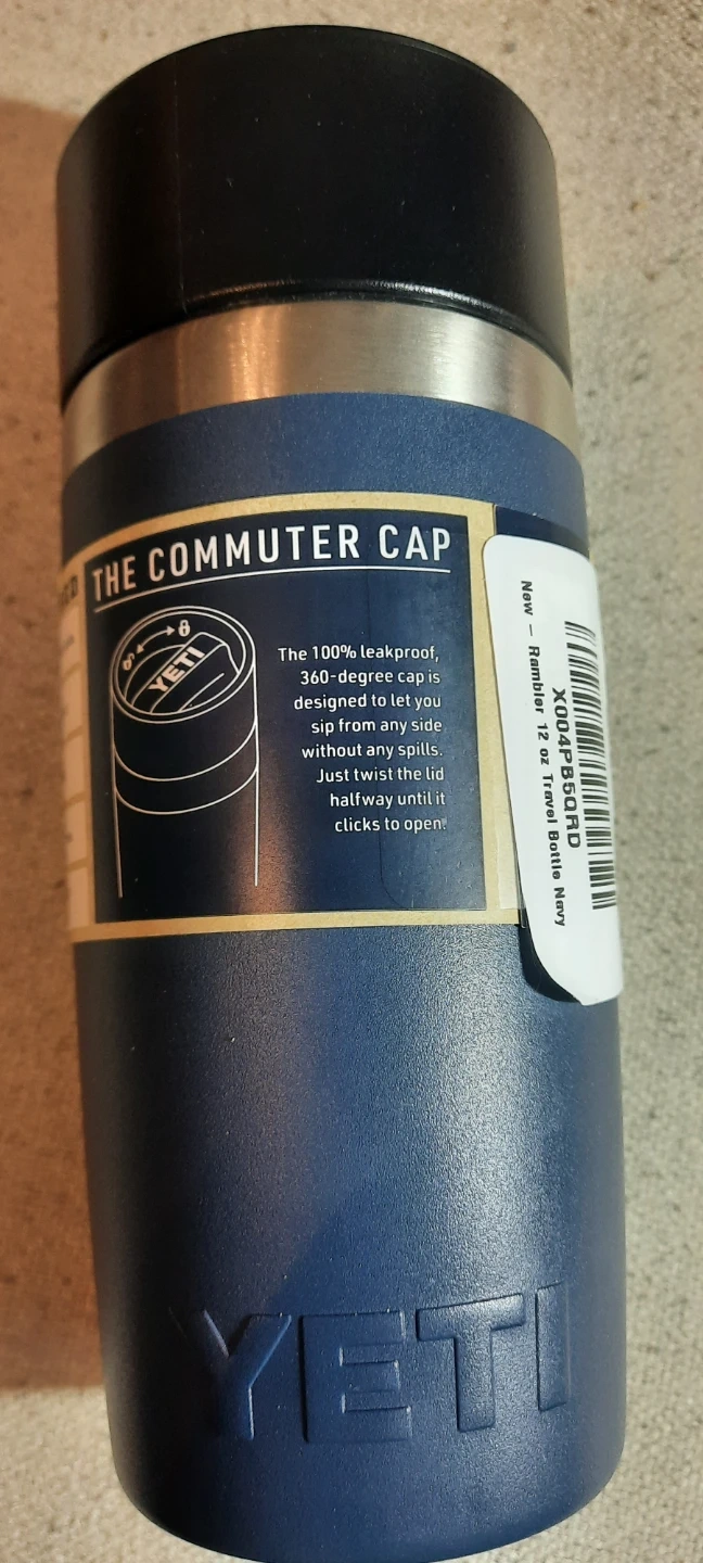 Navy Yeti Rambler 12 oz travel bottle. It comes with a leakproof commuter cap. The cap is designed to let you sip from any side without any spills.