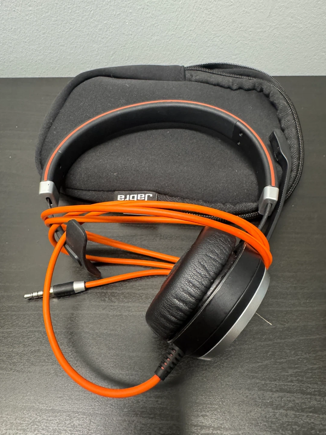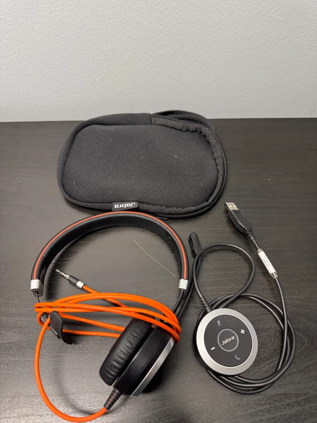 This Jabra Evolve 40headset comes with an inline control unit and a carrying case. It's designed for professional use, offering clear audio for calls and music. The headset features comfortable earcups and an adjustable microphone boom.