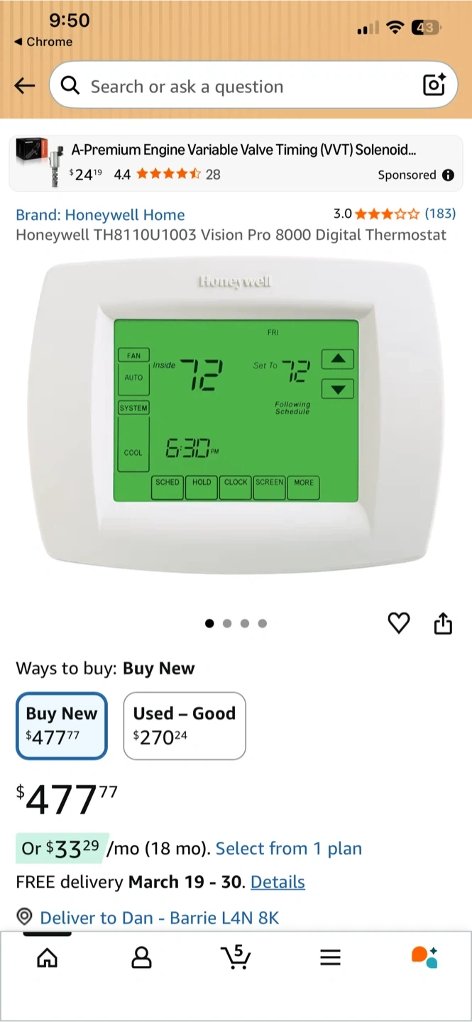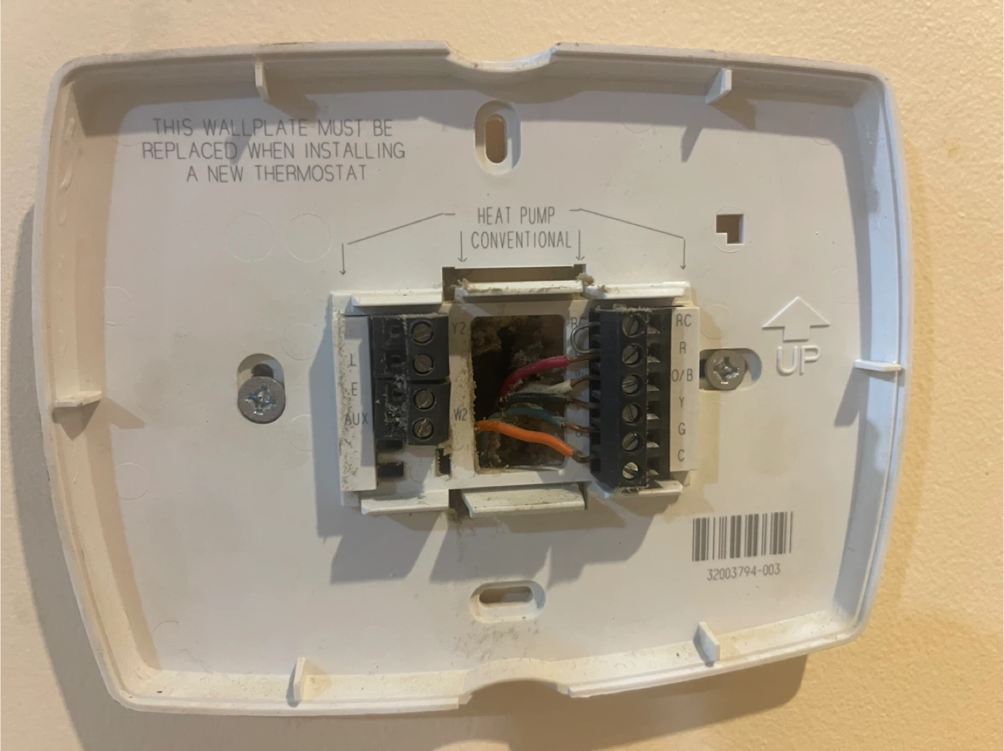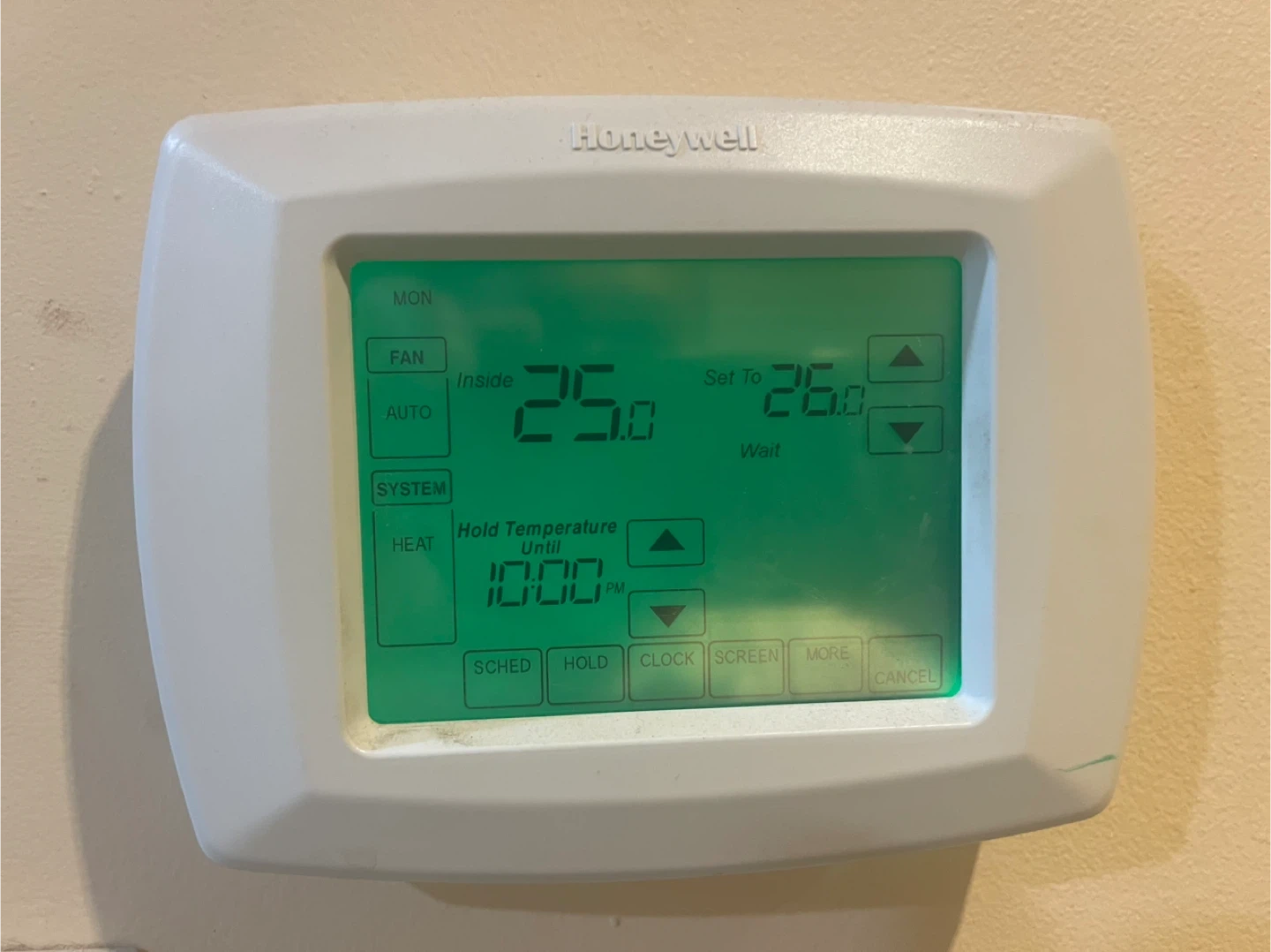 This is a Honeywell Vision Pro 8500 digital thermostat. It has a bright green display and programmable settings for heating and cooling. The thermostat runs on AAA batteries, and has a wallplate included for installation.
