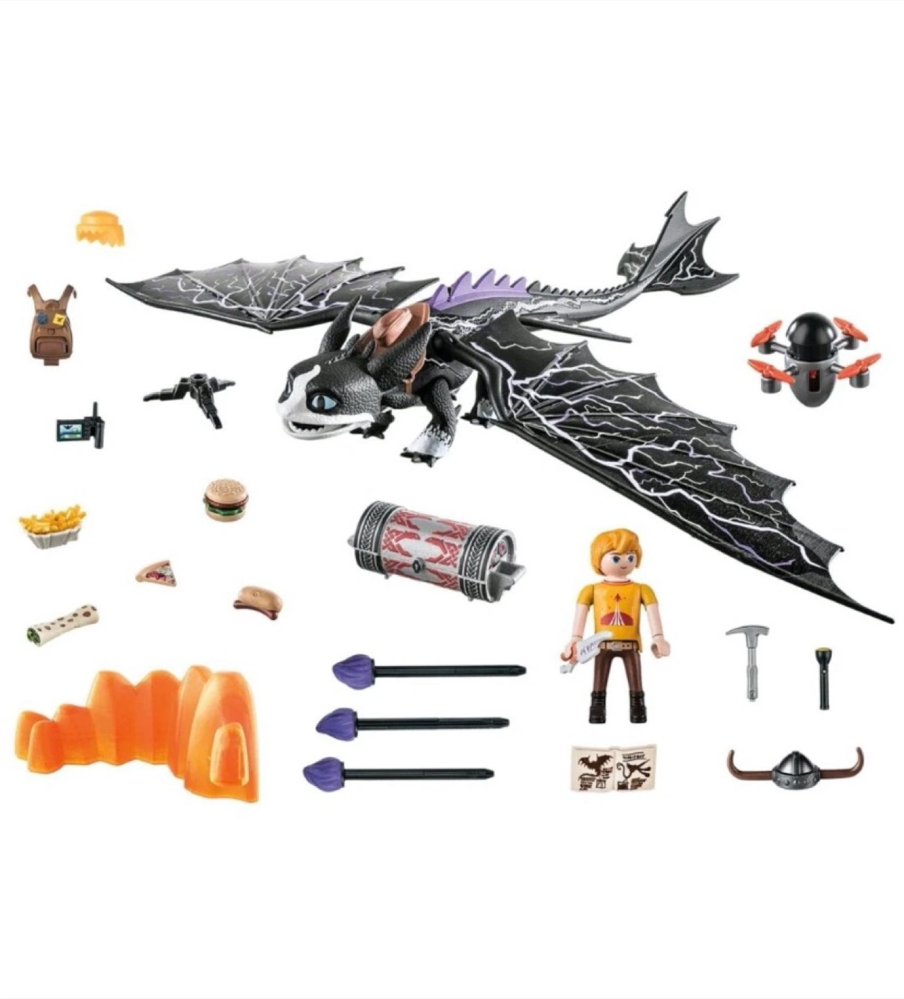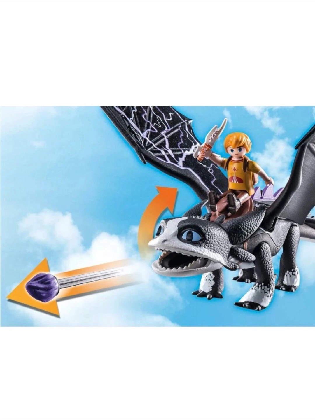 This Playmobil set features a dragon figure from Dreamworks Dragons: The Nine Realms. It includes a rider figure and various accessories. The dragon has movable wings and a projectile-launching feature.