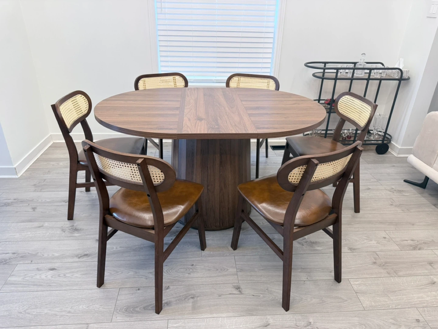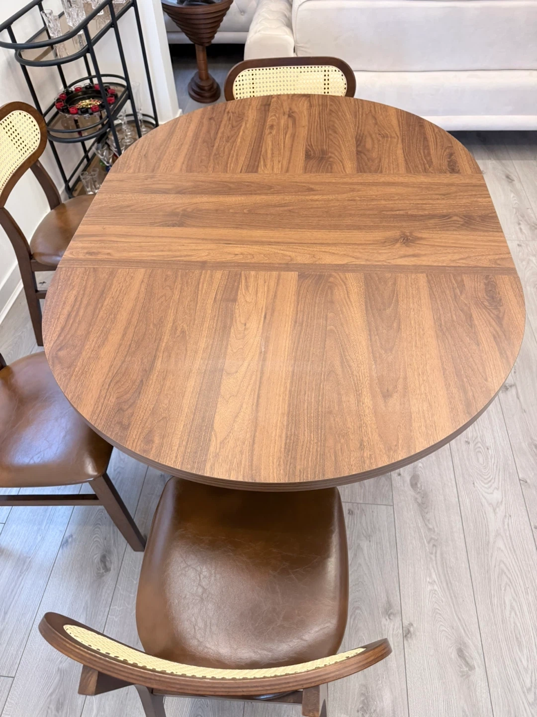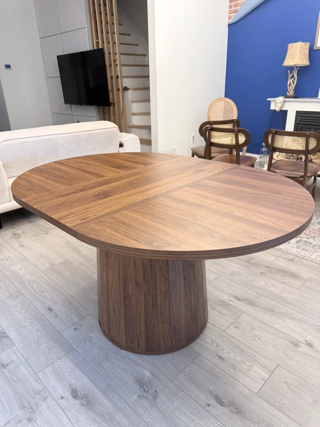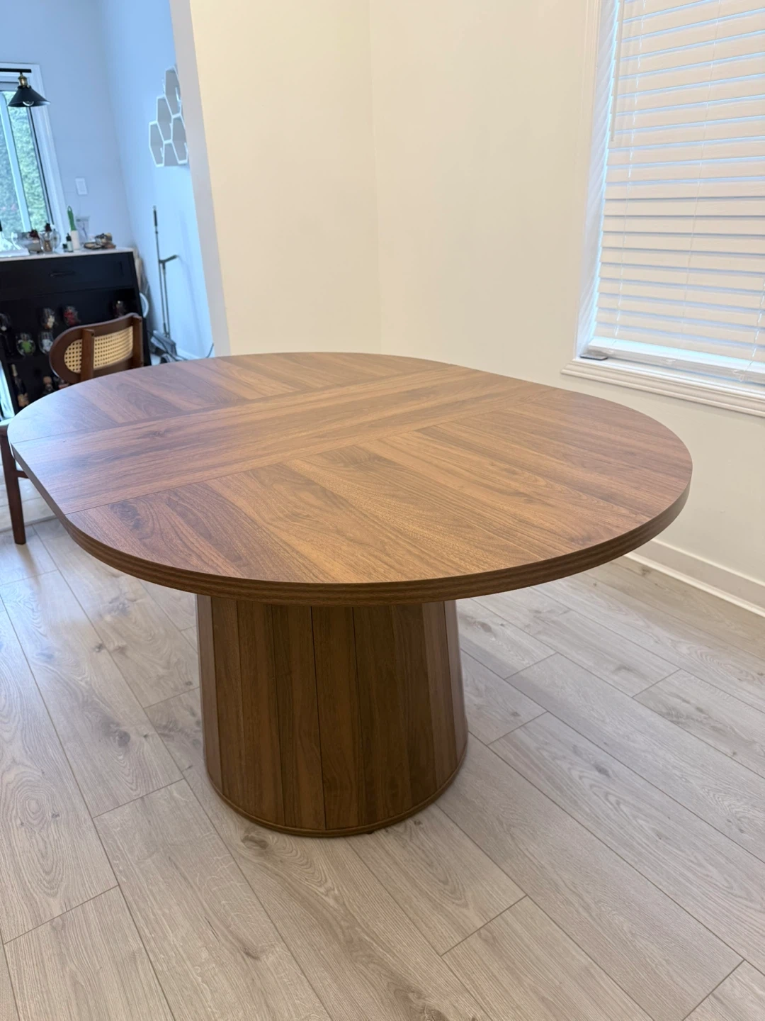 Oval pedestal dining table with a warm walnut finish. In perfect condition in non smoking and no pet home .